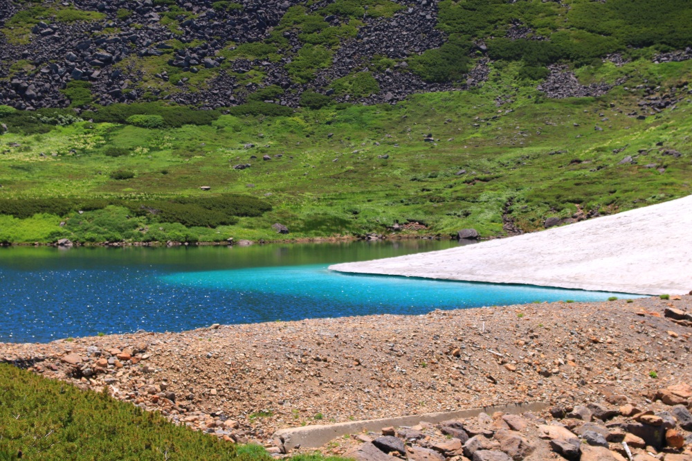 登山道沿いでは、コバルトブルーや翡翠色に輝く火山湖がいくつも点在し、なかでも「権現池」や「不消ヶ池(きえずがいけ)」は写真映えする人気スポット。