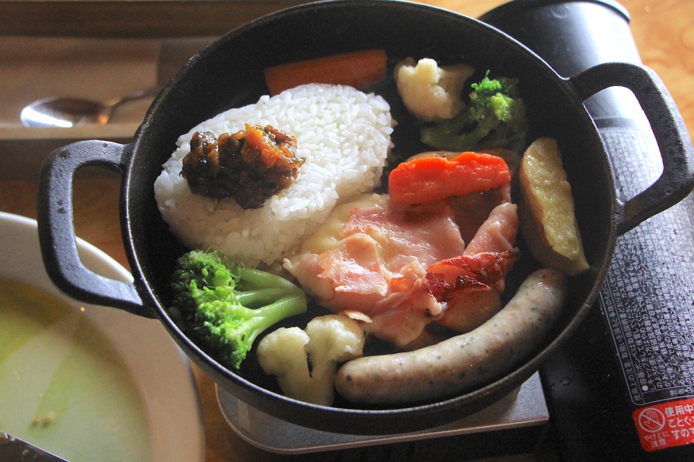スキレットで自ら焼けば、ベーコンの中からチーズがとろり。地元で採れたお野菜とともにいただきます。また郷土料理の五平餅を作ることもできますよ。