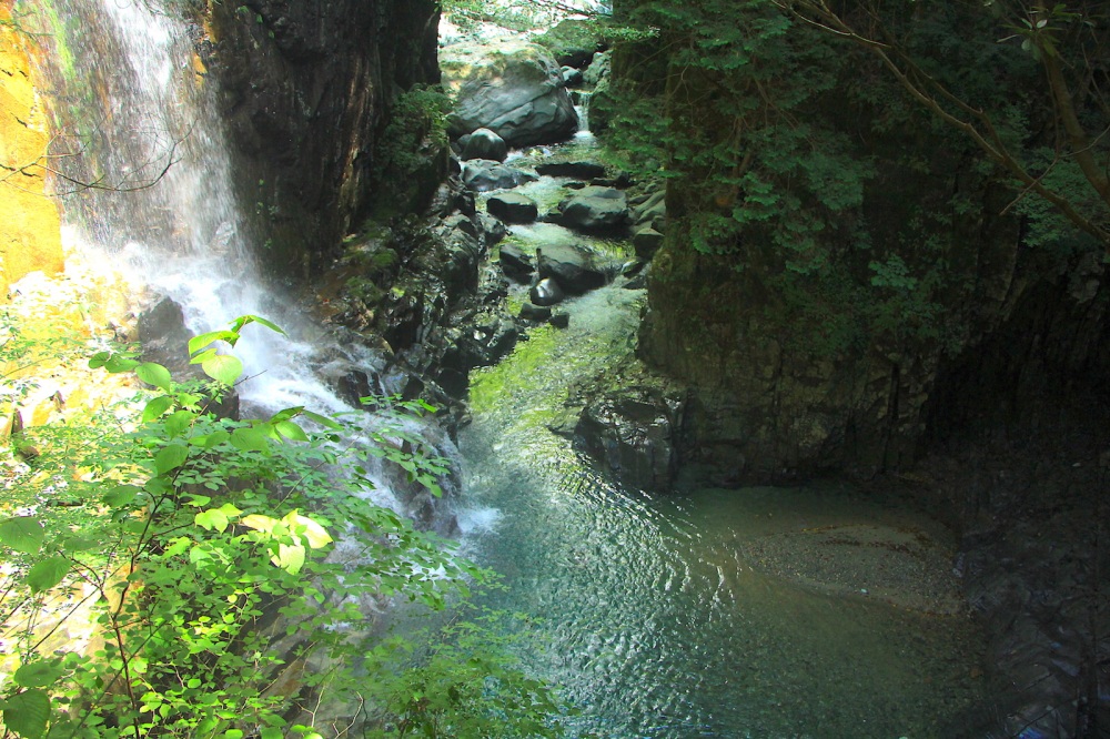 岐阜県屈指の景勝地「付知峡(つけちきょう)」。 御嶽山(おんたけさん、標高3067m)を中心とする阿寺山地が育んだ、宝石のように透き通った清流が特徴です。
