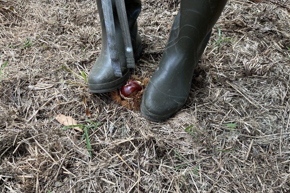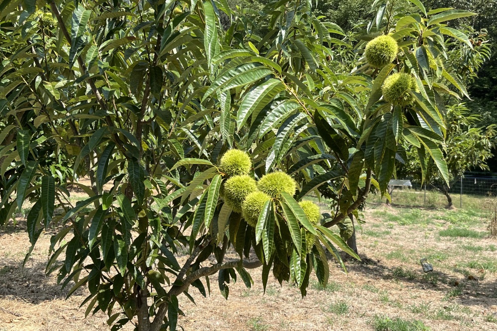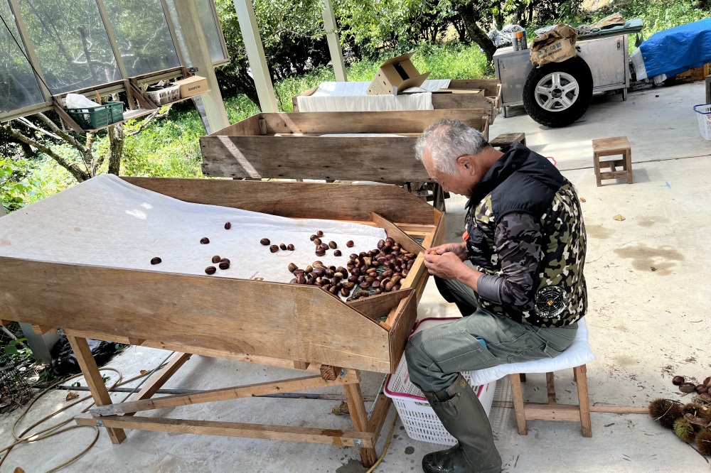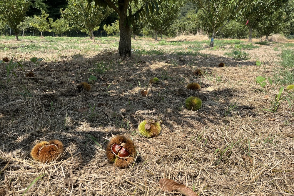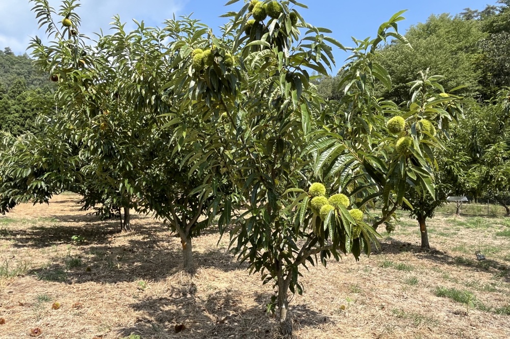 栗農家の三井重徳さんの畑では、1.7haの敷地に栗の木が整然と並び、秋には熟した実が地面に落ちています。