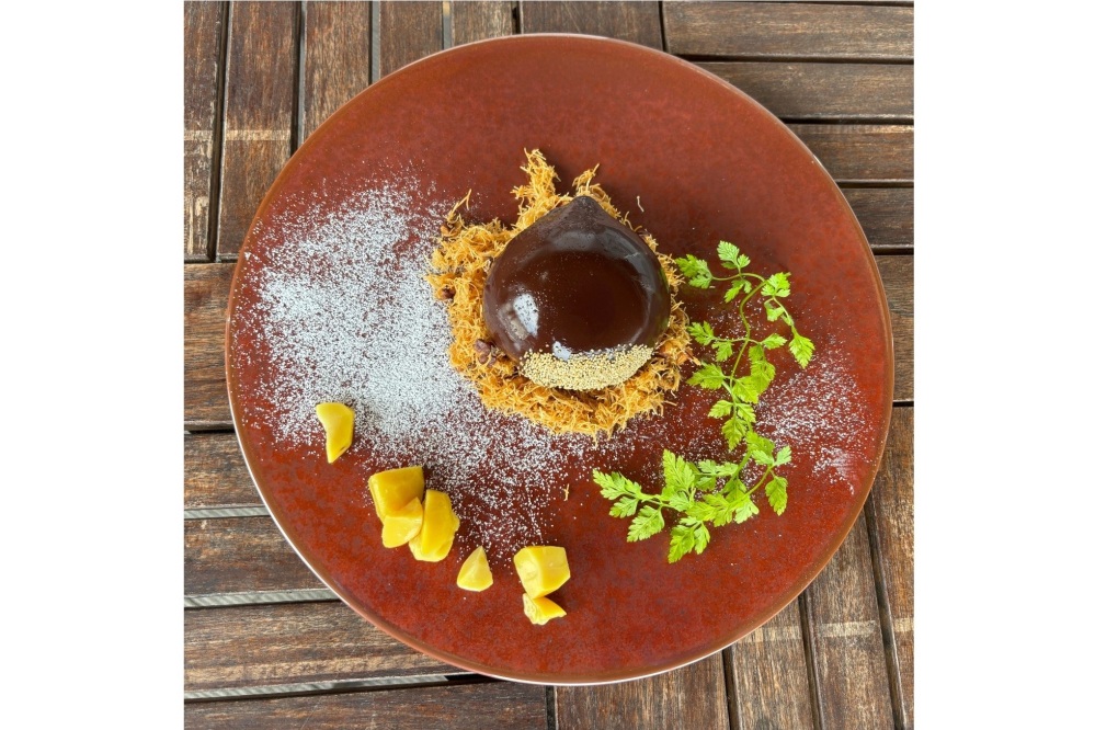 見た目は、大きな栗そのもの。中には、栗の甘露煮やモンブランクリームがぎっしり詰まっています。いがぐりに見立てたパリパリ食感も楽しめる一皿です。