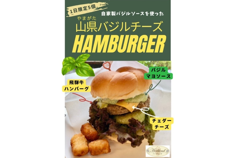 今回は1日限定5食の「山県バジルチーズハンバーガー」をいただきました。飛騨牛のハンバーグにチェダーチーズ、自家製バジルソースが重なり、ボリュームも味わいも大満足!