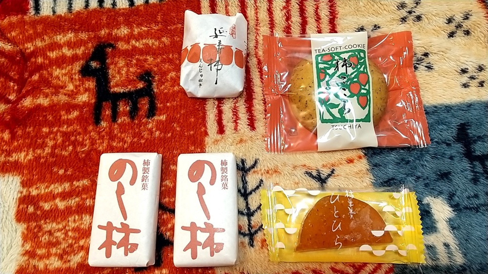 柿羊羹ひとひら1枚、延寿柿1個、柿ごころ1個、のし柿2枚