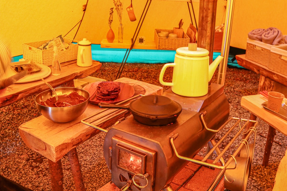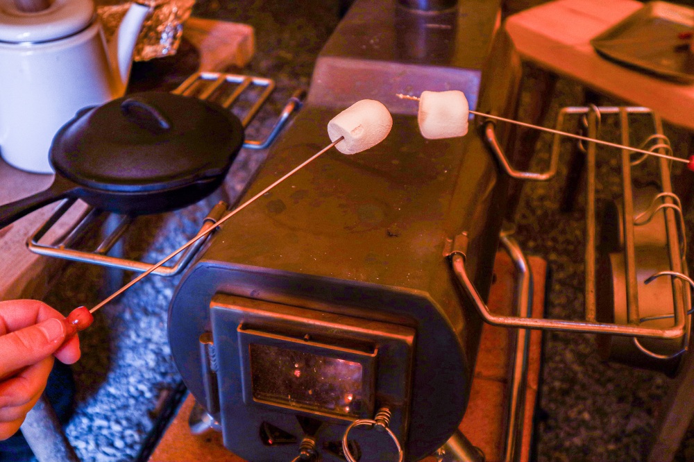 施設内にあるテントや焚火台を貸切れる「小坂な焚火カフェ」で下呂市の名店ジークフリーダシェフ監修のチョコパンケーキや焼きマシュマロなどの体験グルメもおすすめです!