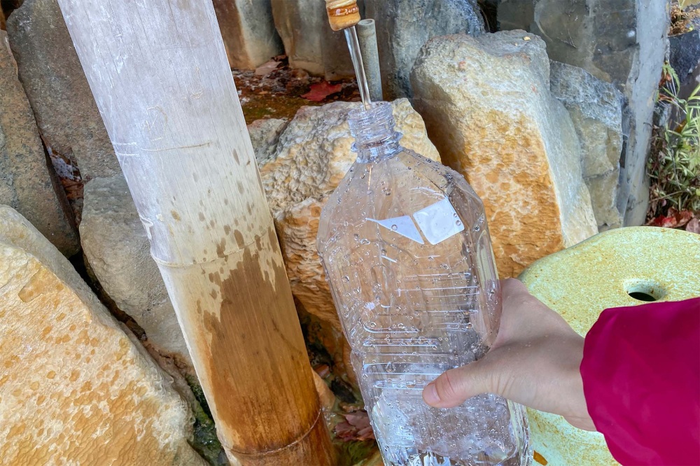 持ち帰り用ペットボトルは「ひめしゃがの湯」で購入したもの。(もっと大きな容器で持ち帰っている方もいました!)