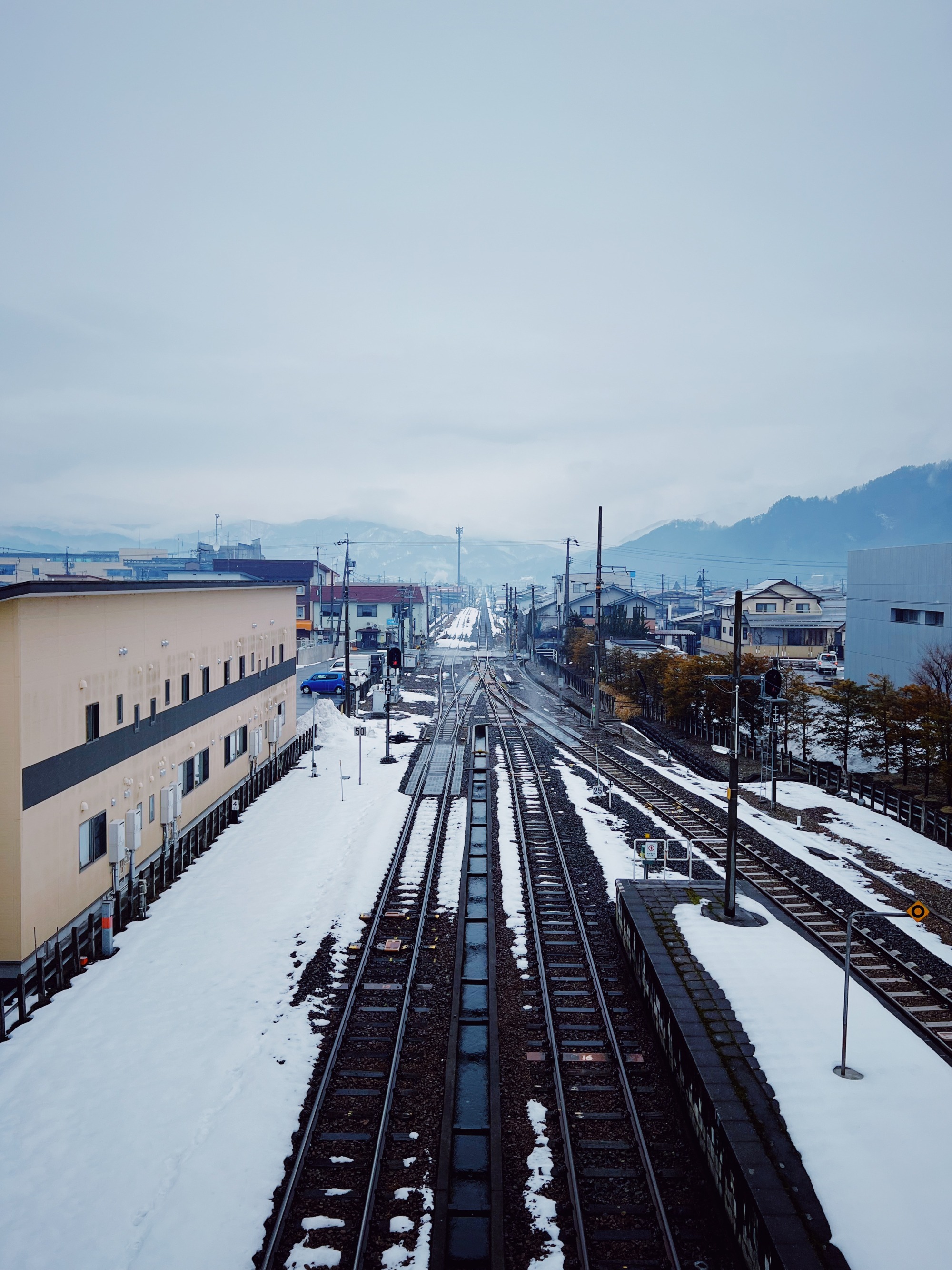 雪でけぶる山の向こうに延々と続いていく線路が、なんとも美しい……。どこか「秒速5センチメートル」っぽさも感じる景色です。