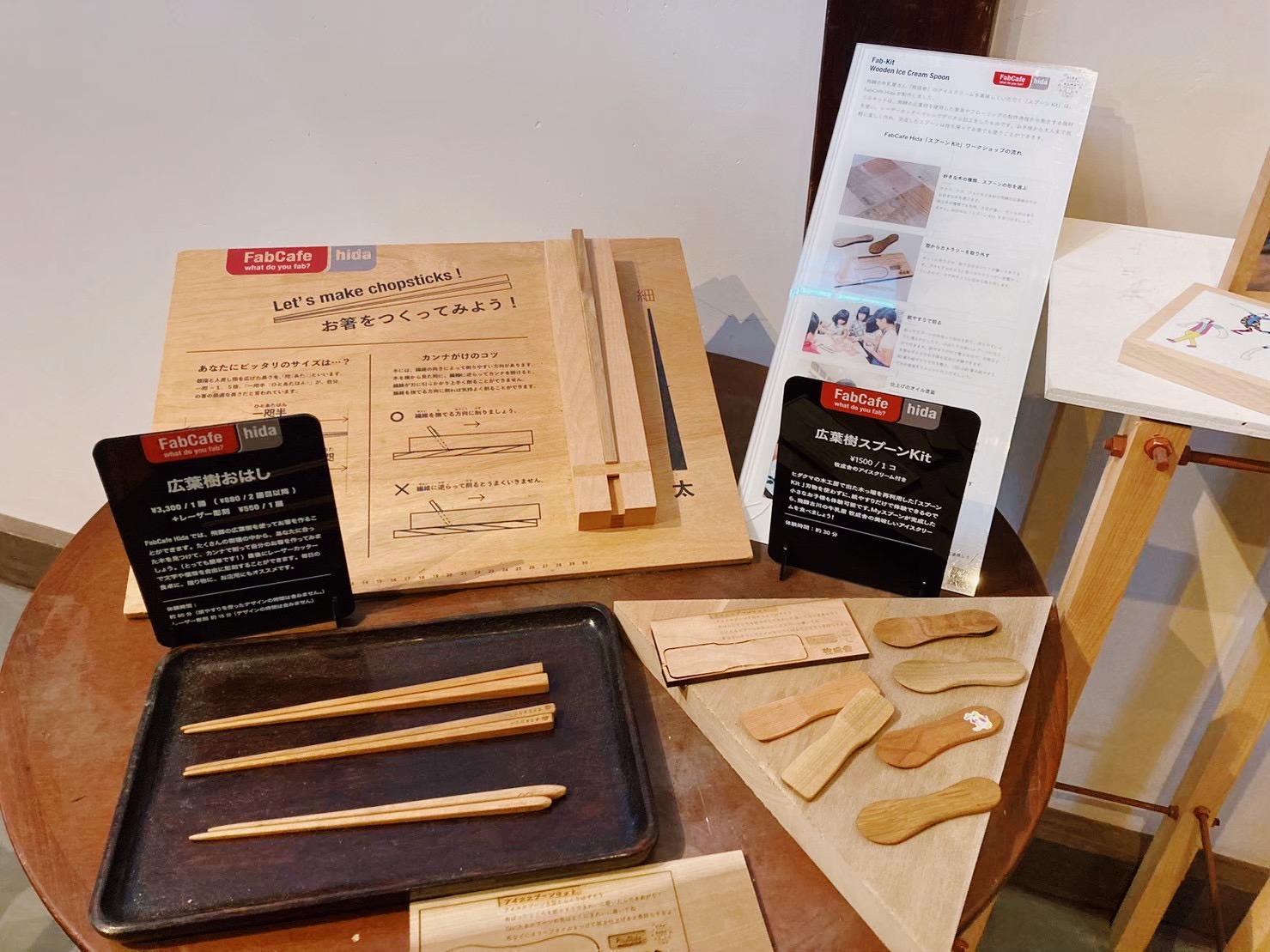 クラフト体験は、いずれも飛騨の木を使ったお箸作り、スタンプ作り、その地酒と一緒に楽しめる升のカップにデザインをする体験など様々な種類があります。