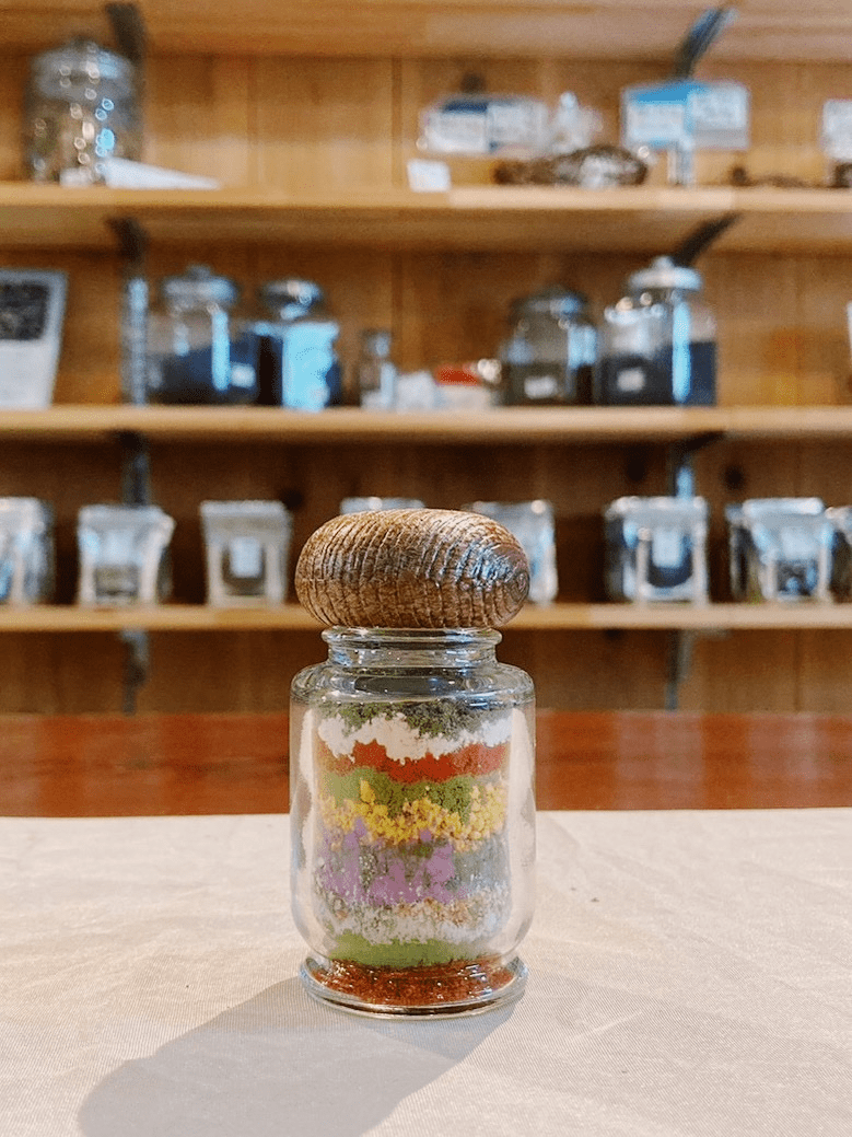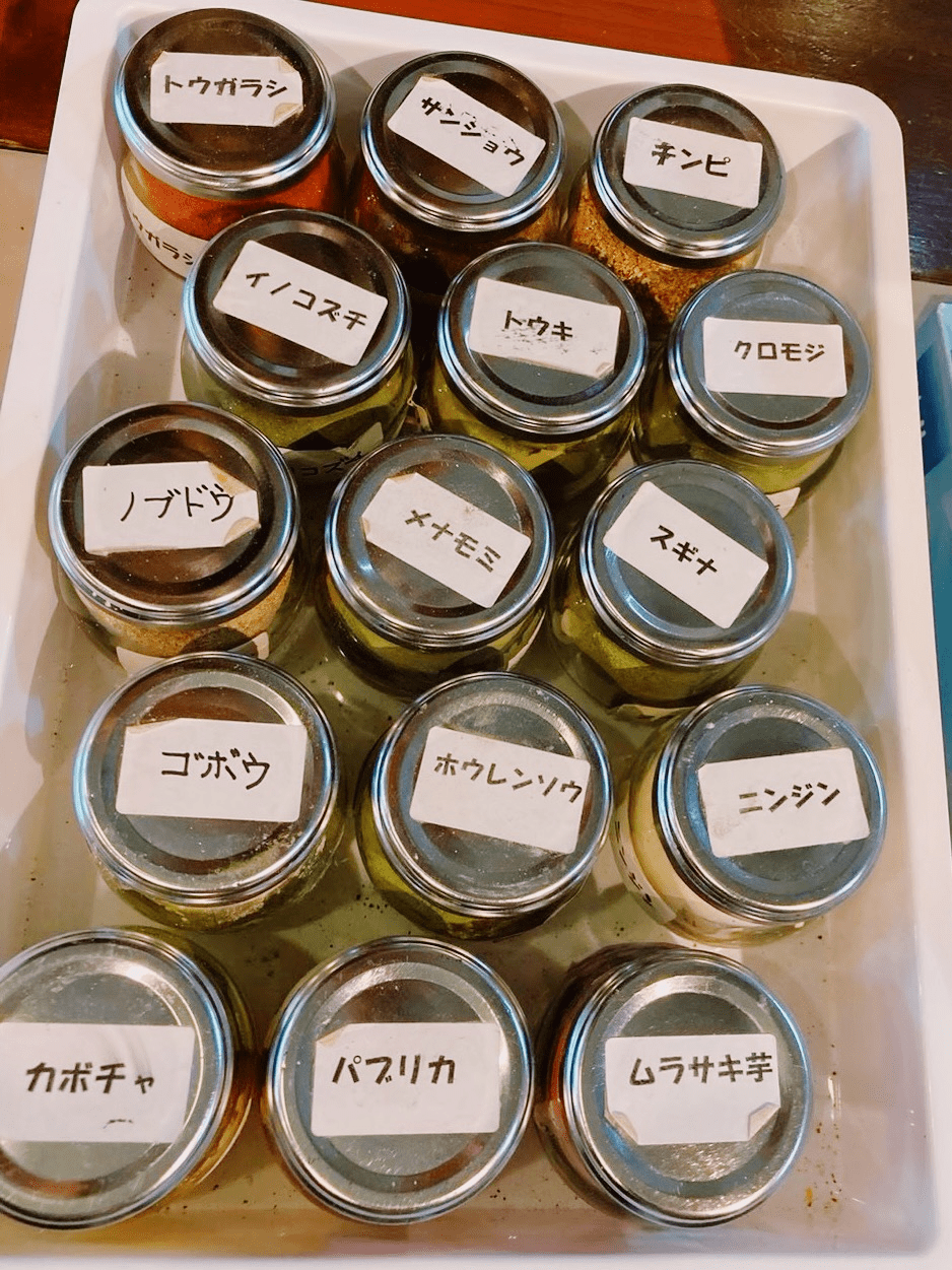 飛騨産の薬草や野菜など、10種類以上のパウダーが用意されており、好きなものを選び、自分だけのオリジナル七味をブレンドできます。