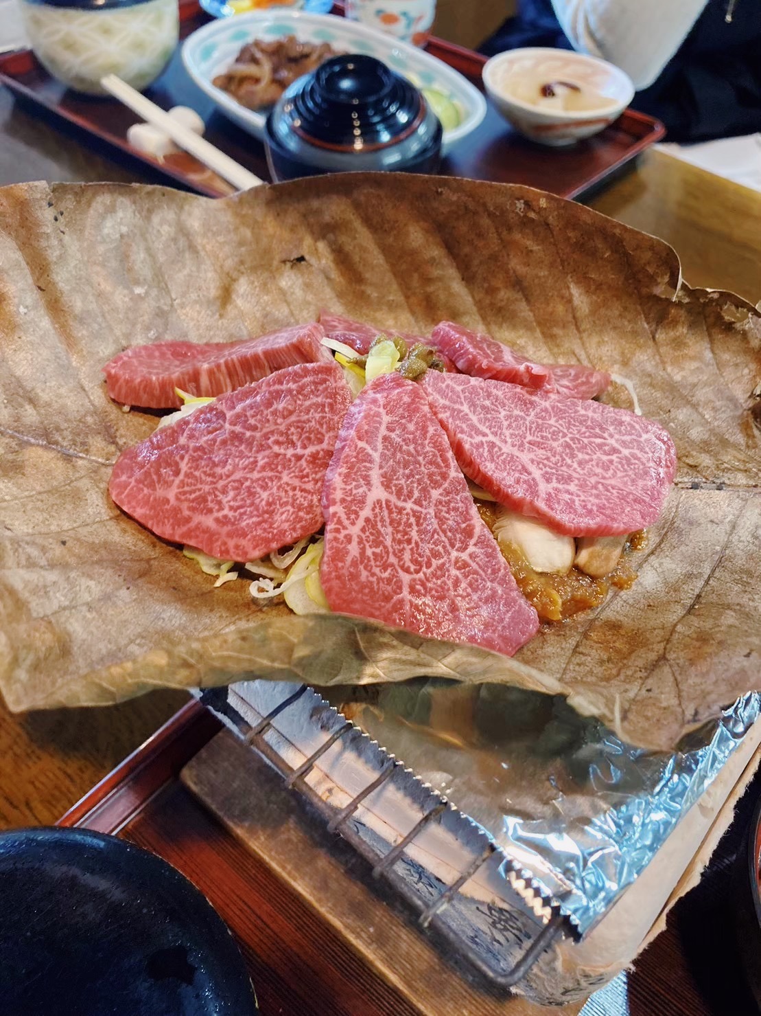 ぜいたくにも、サシの入ったジューシーな飛騨牛を朴葉の上の自家製こうじ味噌で焼き上げる、冬にぴったりのごちそうメニュー。