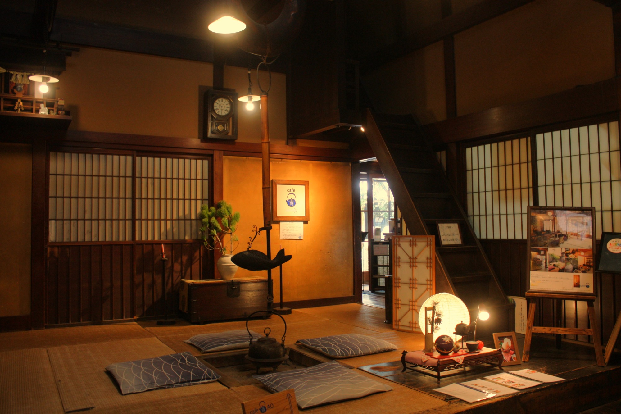 広い土間が続く建物の中ほどにあるのが「café 青(かふぇ あお)」。店先の看板と「囲炉裏」が目印の古民家カフェです。
