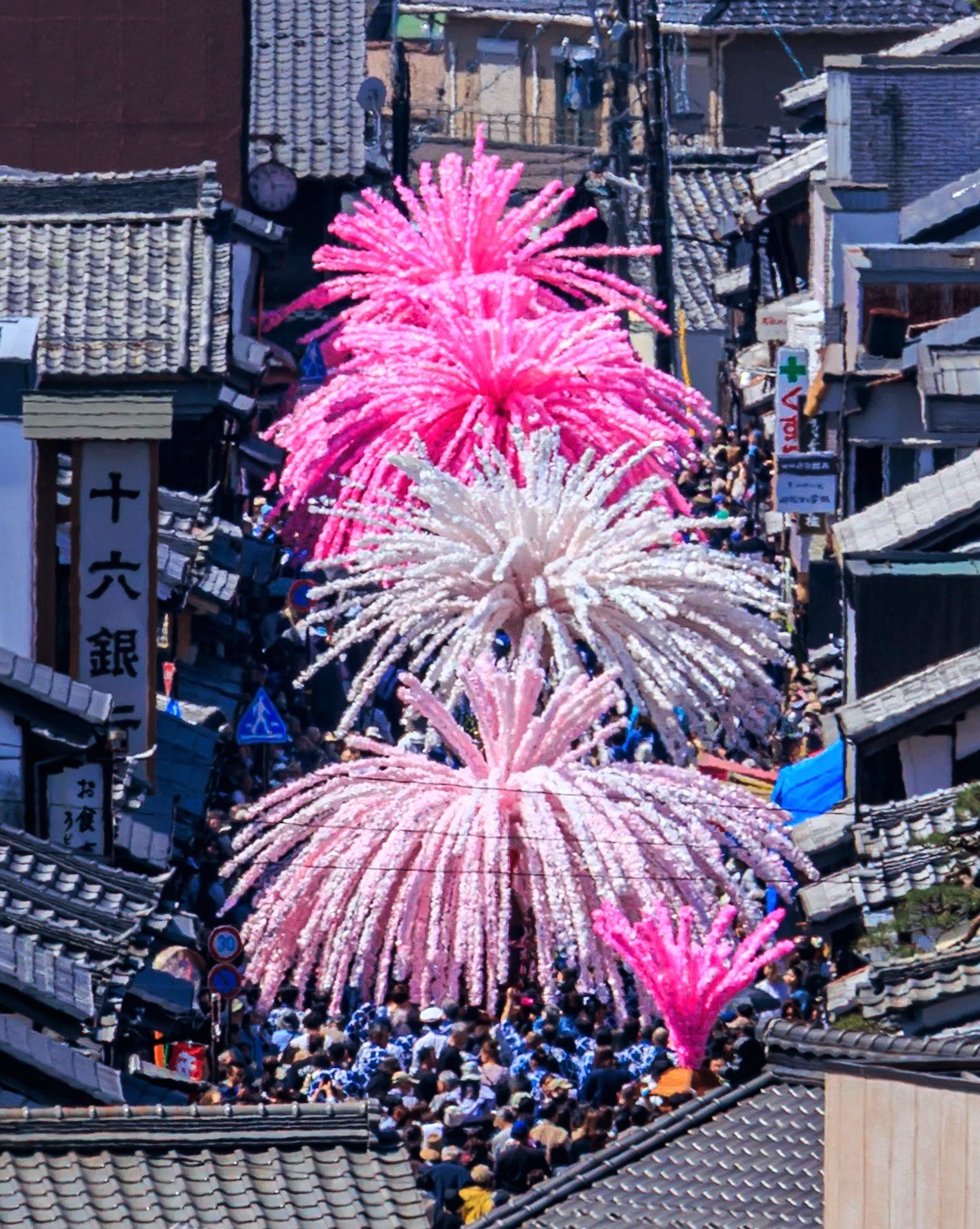 乱舞: 大小あわせて約20余基の「花みこし」が、神輿の担ぎ手たちの、威勢の良い『オイサー!』の掛け声とともに街中を練り歩きます。神輿を激しく上下に揺らしたり回転させたりする姿は、まるで本物の桜の花が乱舞しているような美しさです。