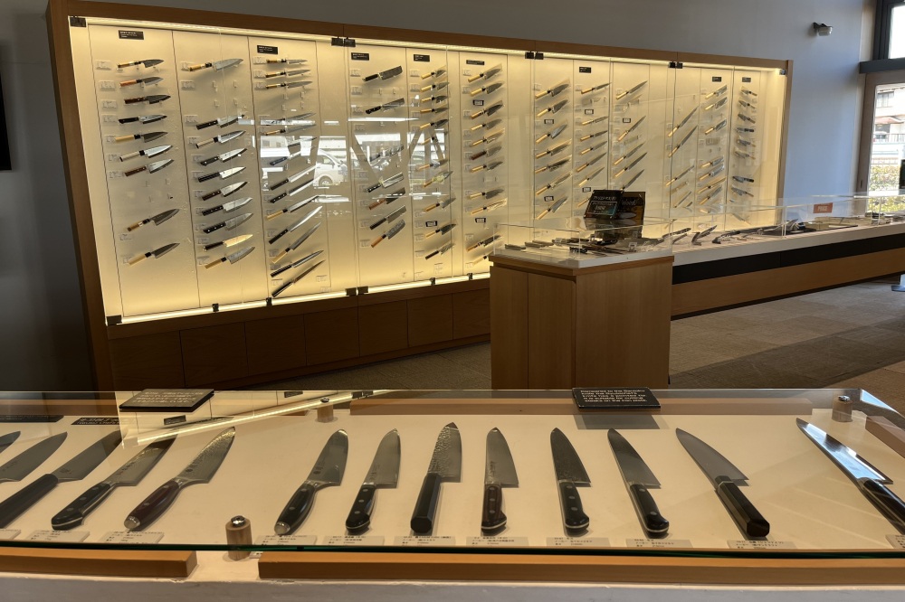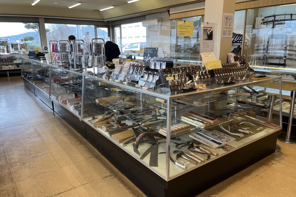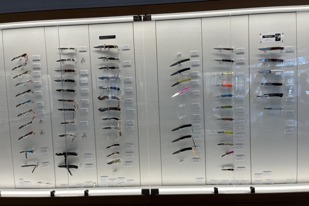 その迫力に思わず圧倒されます。三徳包丁や牛刀といった各種包丁をはじめ、ポケットナイフなど、多彩な刃物が展示・販売されています。