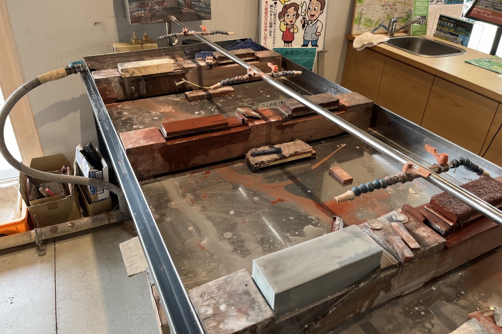 話を伺うと、1日に30~50本ほどの包丁が持ち込まれるそうです。作業は機械での下研ぎの後、600番・1000番・1500番の砥石で丁寧に仕上げられます。