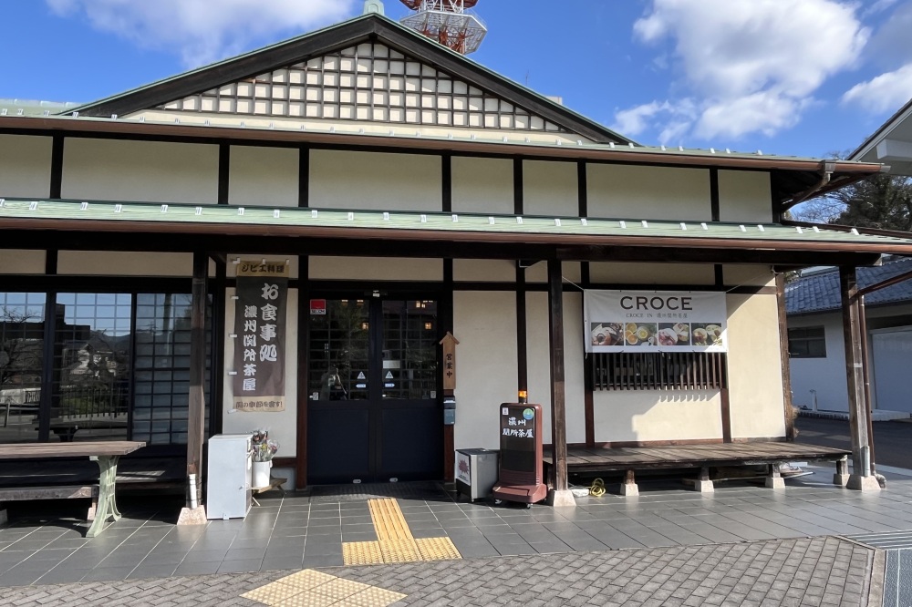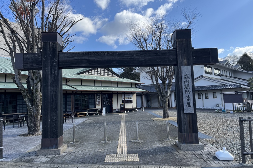 「濃洲関所茶屋」は、高さ4メートルの冠木門が目印の休憩施設です。