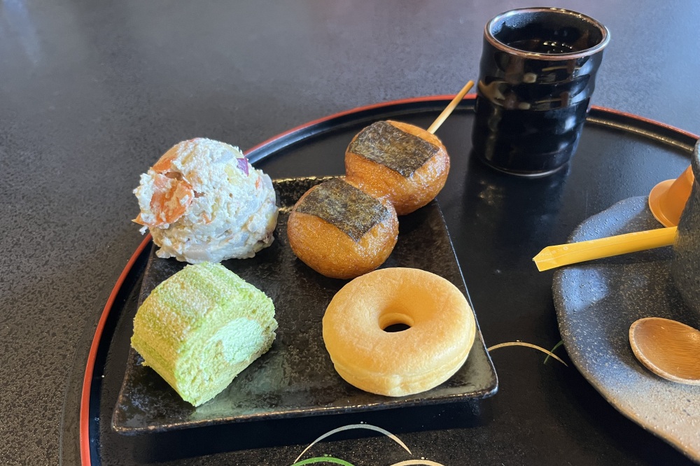 CROCE(クローチェ)のベーグルは種類が豊富で、選ぶのに迷うほど。豆乳ドーナツセットには、揚げ餅やサラダ、ミニロールケーキも付いていて大満足!