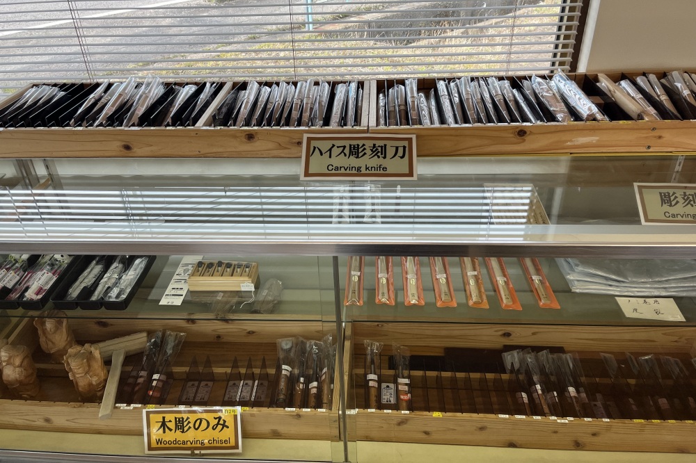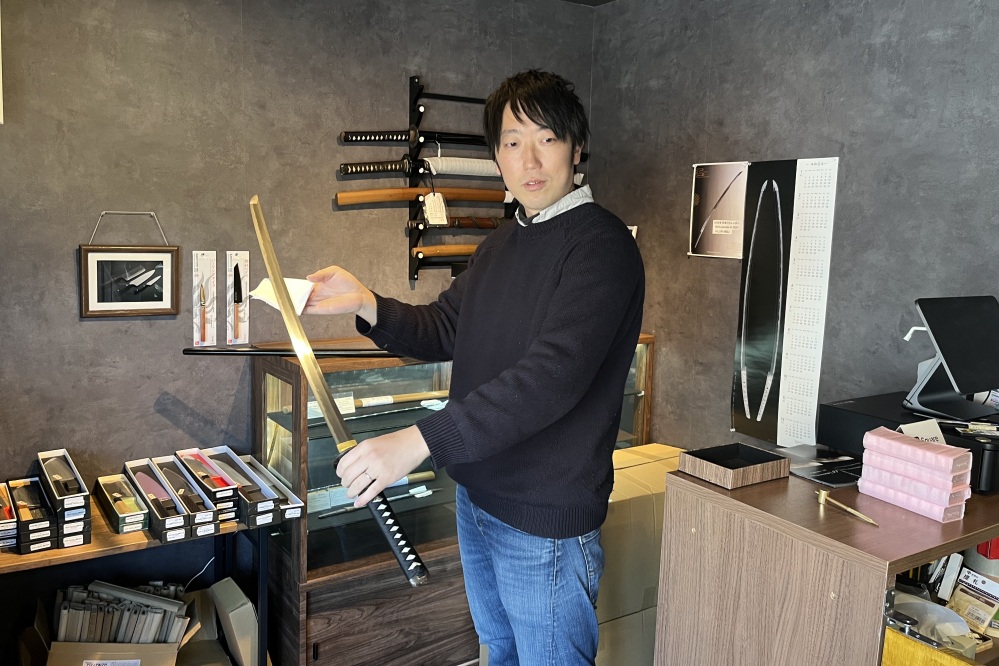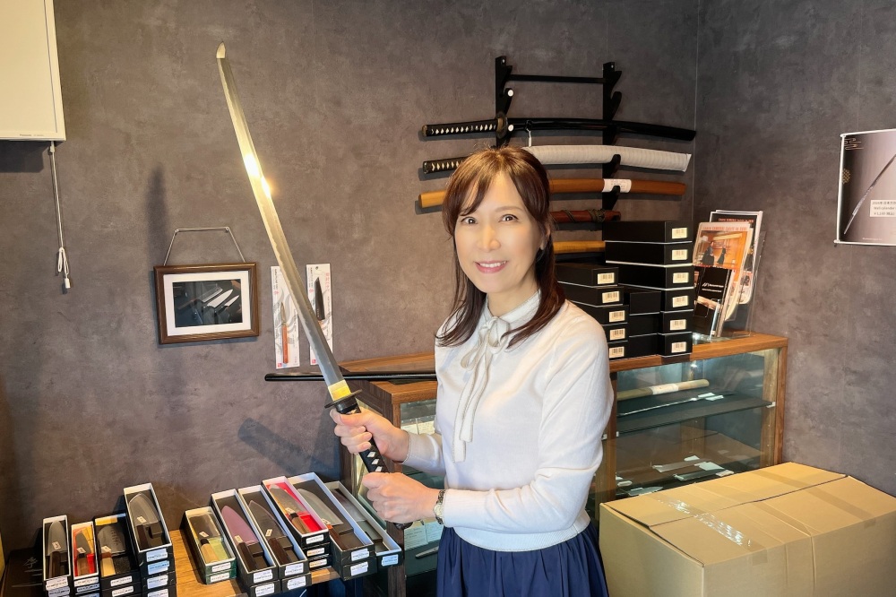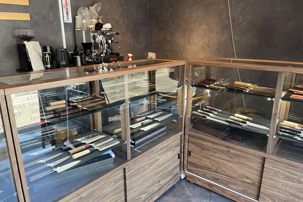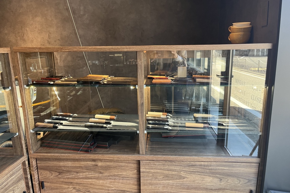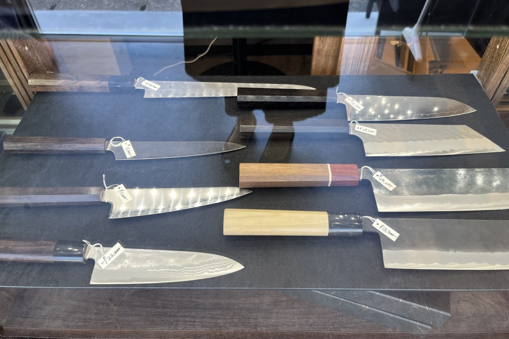 包丁や日本刀の販売を行っており、ショーケースに並ぶ包丁は思わず見入ってしまうほどの美しさです。
