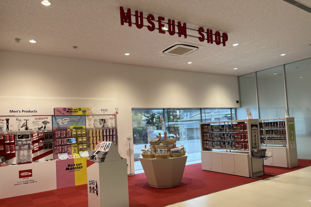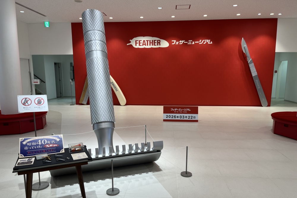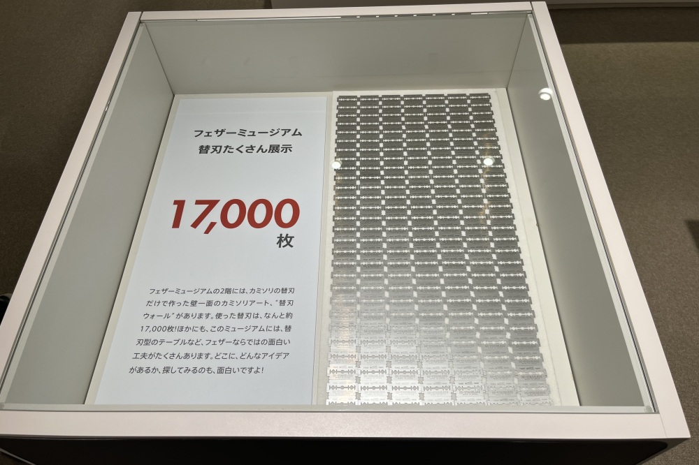 1階エントランスでは、巨大なひげ剃り「ジャイアントフェザー」がお出迎え。受付でパンフレットを受け取り、館内を見学します。