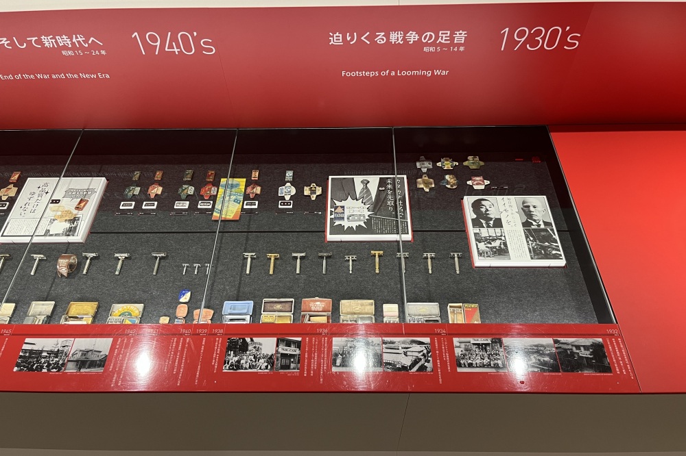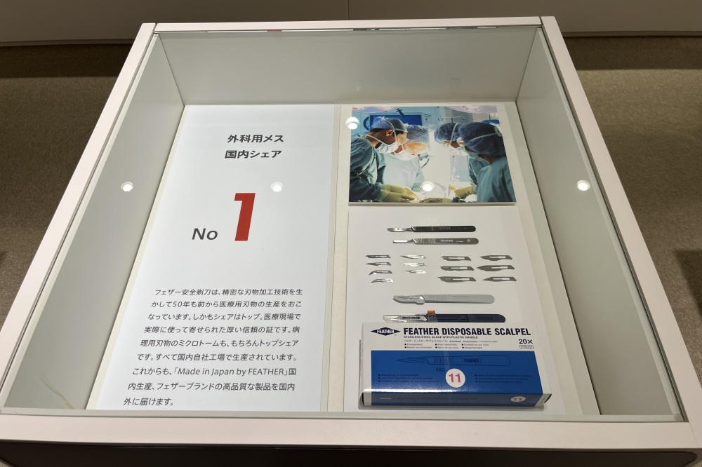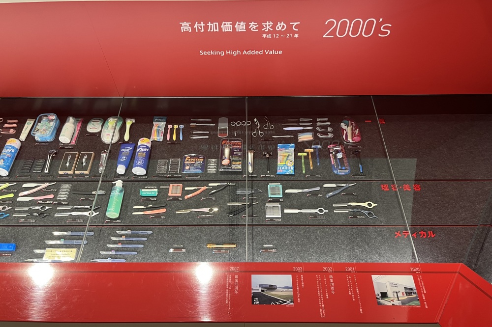 まずはフェザーヒストリーへ。創業当時から現在に至るまでの製品が展示されており、時代とともに進化してきたものづくりの歩みを感じることができます。
