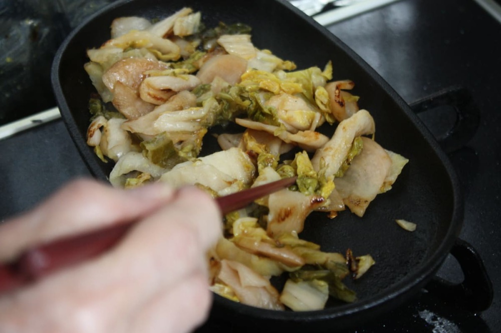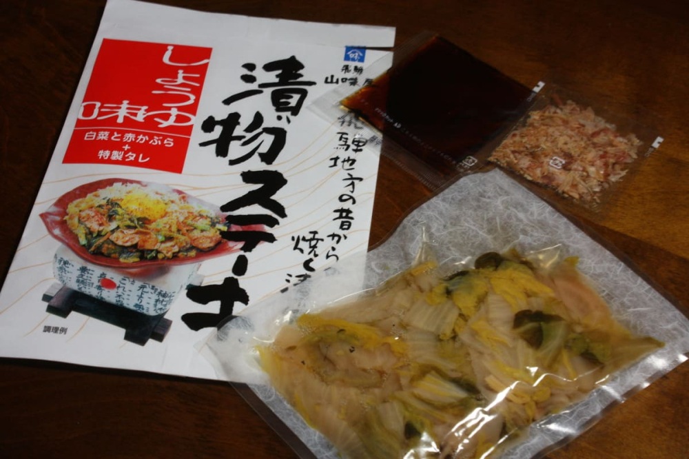 飛騨山味屋の「漬物ステーキ」は、創業100年の老舗お漬物メーカー「飛騨山味屋」の人気商品です。白菜と赤かぶらの漬物をフライパンやホットプレートで焼き、付属の特製ダレや削りぶしを加え、お好みで溶き卵を流し入れて仕上げます。