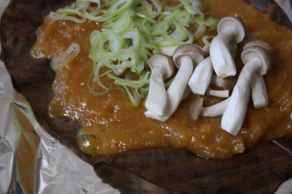 朴葉と味噌がセットになっており、朴葉を洗って1時間ほど水に浸した後、ホットプレートなどで焼いて調理します。お好みできのこやネギを添えると、味噌の風味がより引き立ちます。