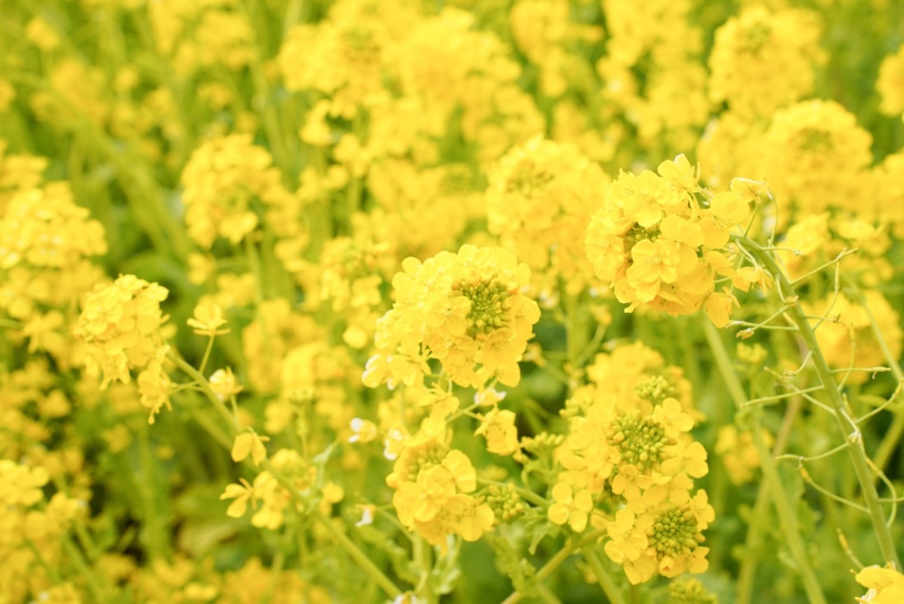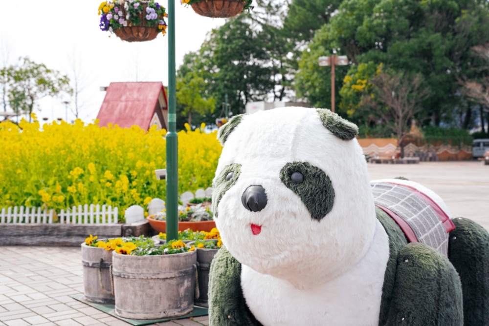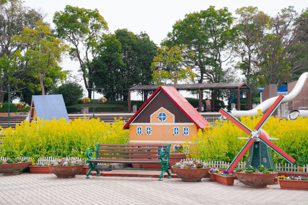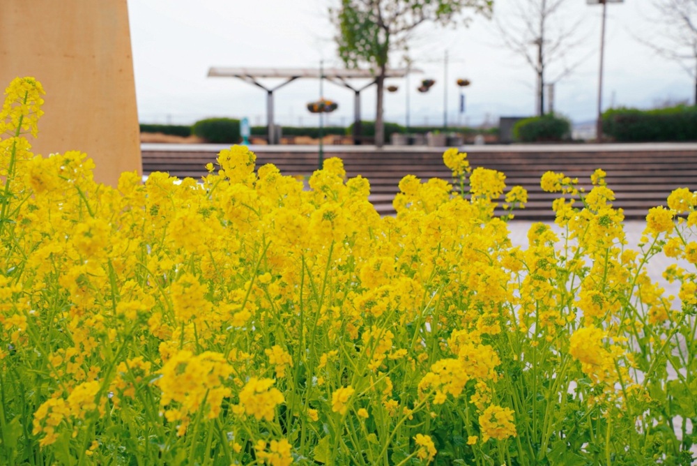 まず入口では、色とりどりのパンジーがたくさん咲いたおうちがあります。奥のベンチに座ると、パンジーのおうちに囲まれた写真が撮れます。そのまま、公園を進んでいくと、一面の菜の花畑が広がります。菜の花の鮮やかな色合いは、春の風物詩ですね。こちらも、ベンチに座ることで、菜の花に囲まれた素敵な写真を撮ることができるようになっています。