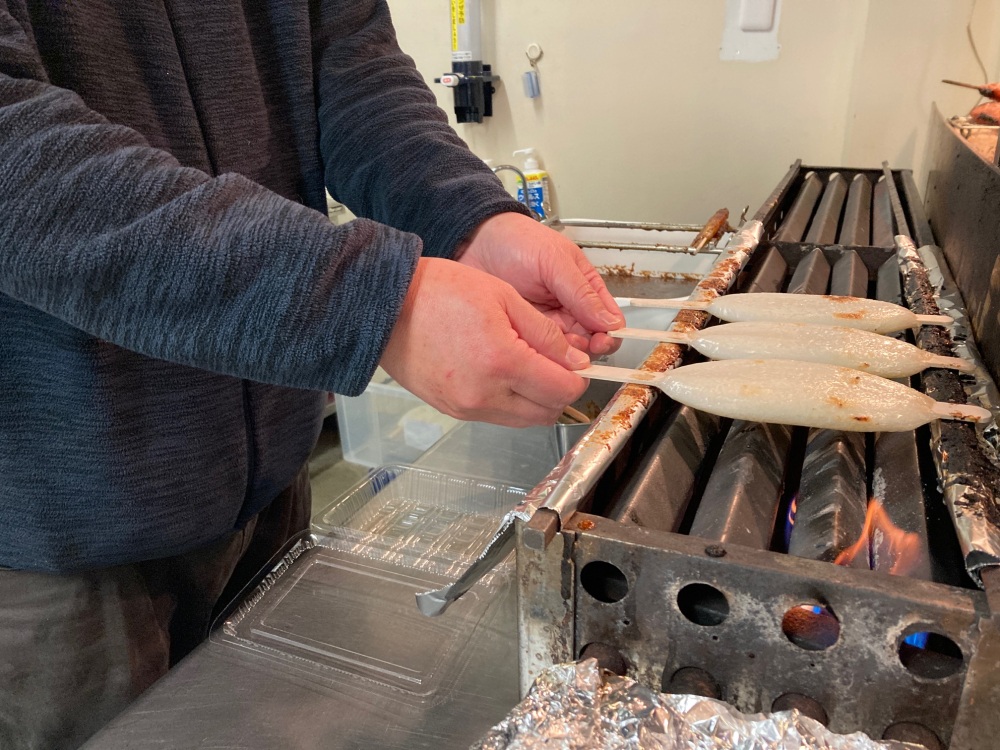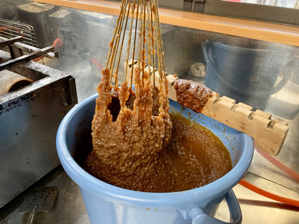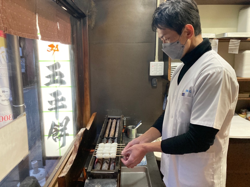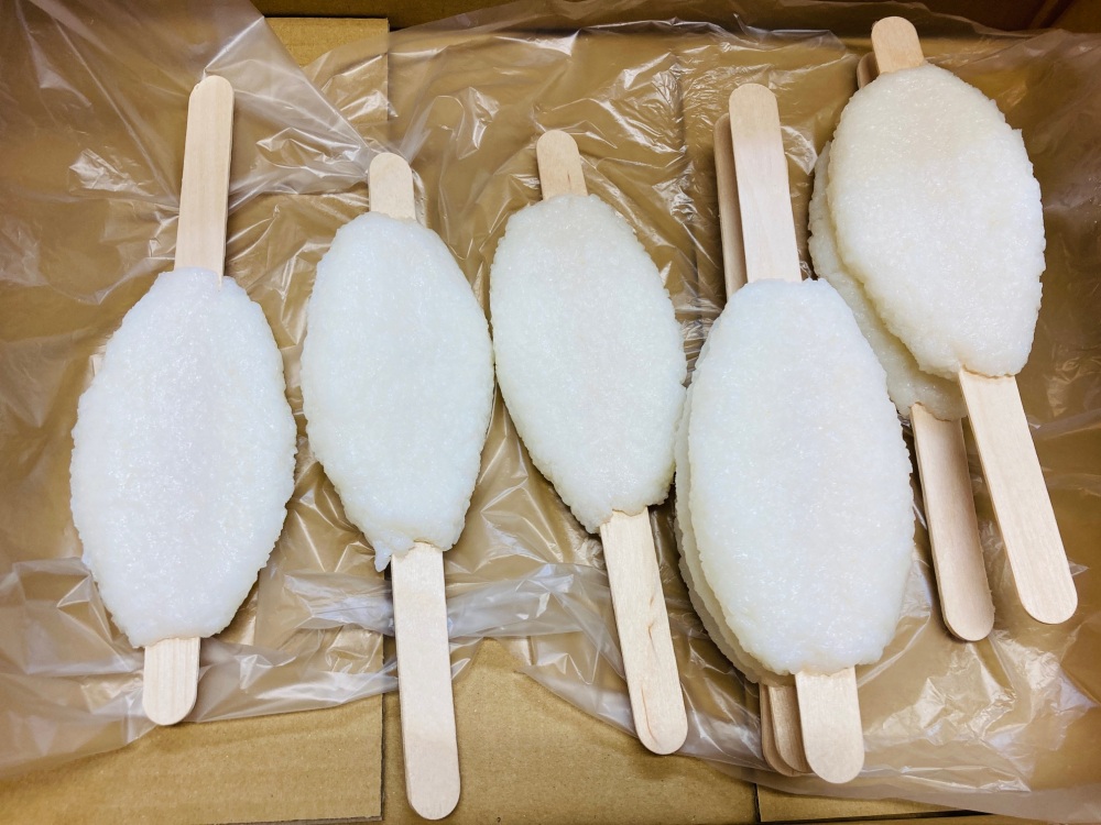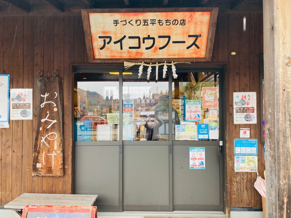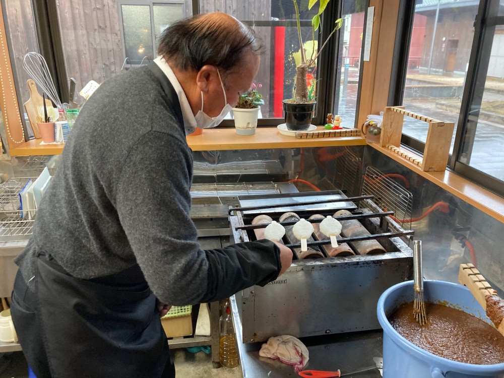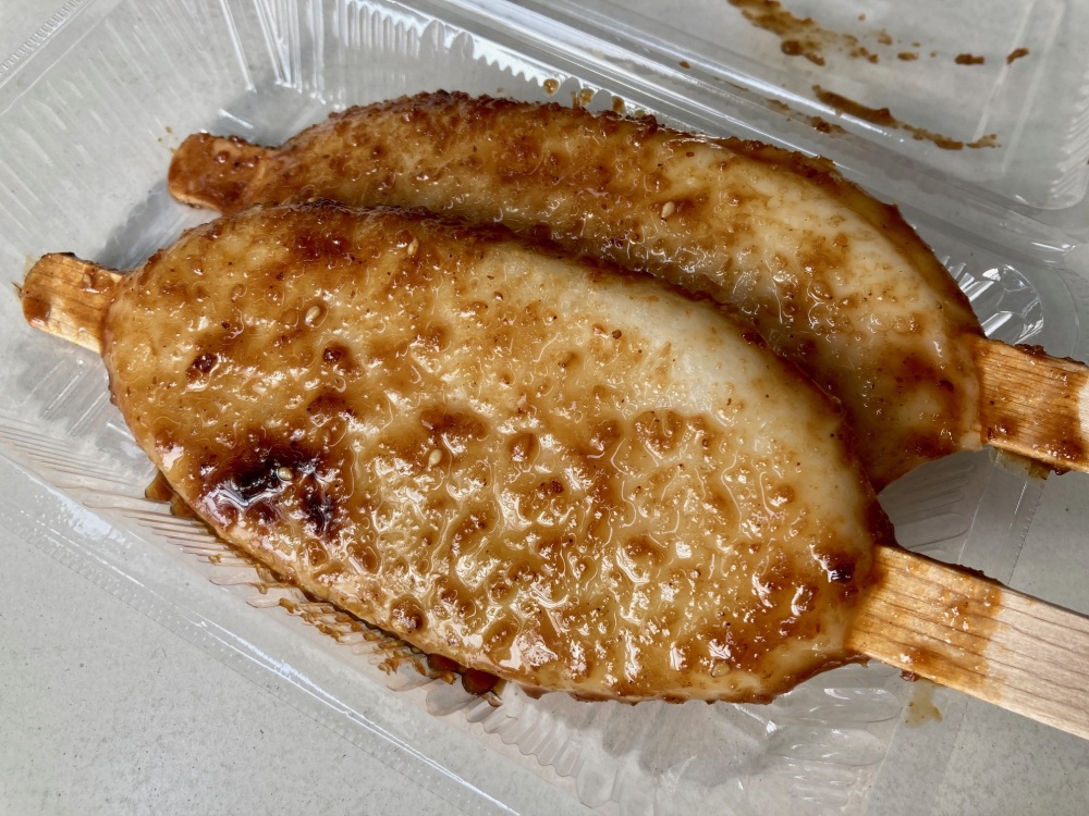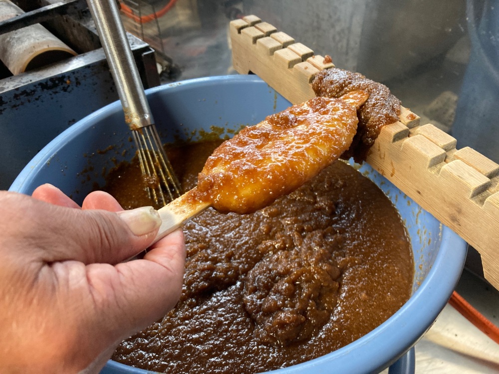 日本大正村がある明知町のお店「アイコウフーズ」。こちらの手作り五平餅は、地元 岐阜県東濃産をメインに国産米のみを使用。タレは醤油ベースで落花生、胡麻をたっぷり使用した甘めのタレが特徴。以前は、くるみも入れていたそうですがアレルギーの方のことを考えて材料から外したんだそう。安心して食べられお子さんも買える1本180円という安さで提供。厚みがあって食べ応え満点。様々な年代の方に愛されている五平餅です。