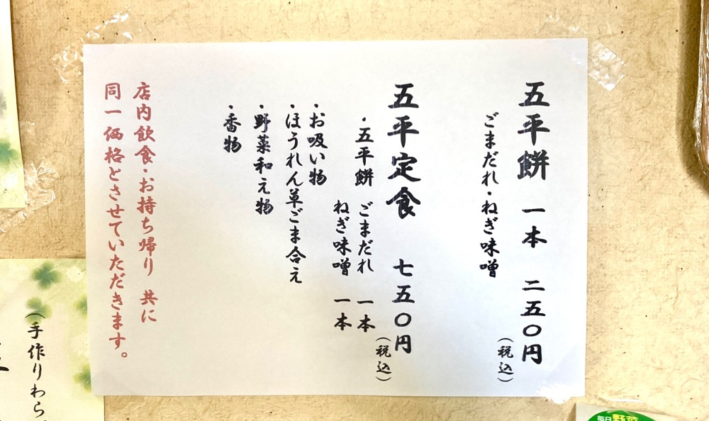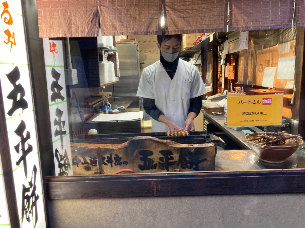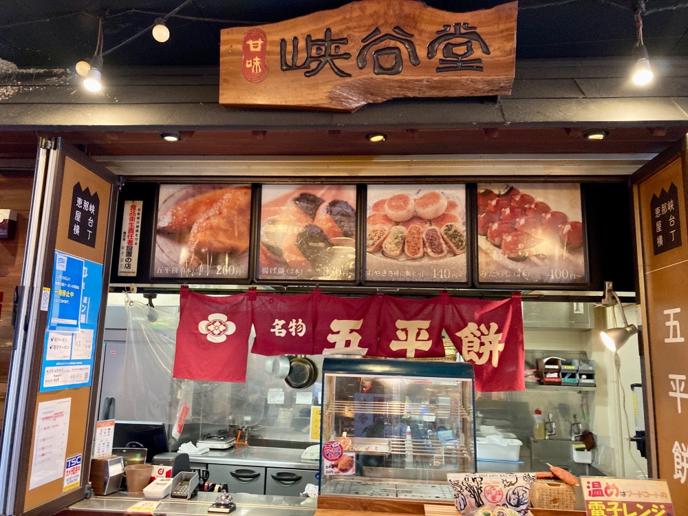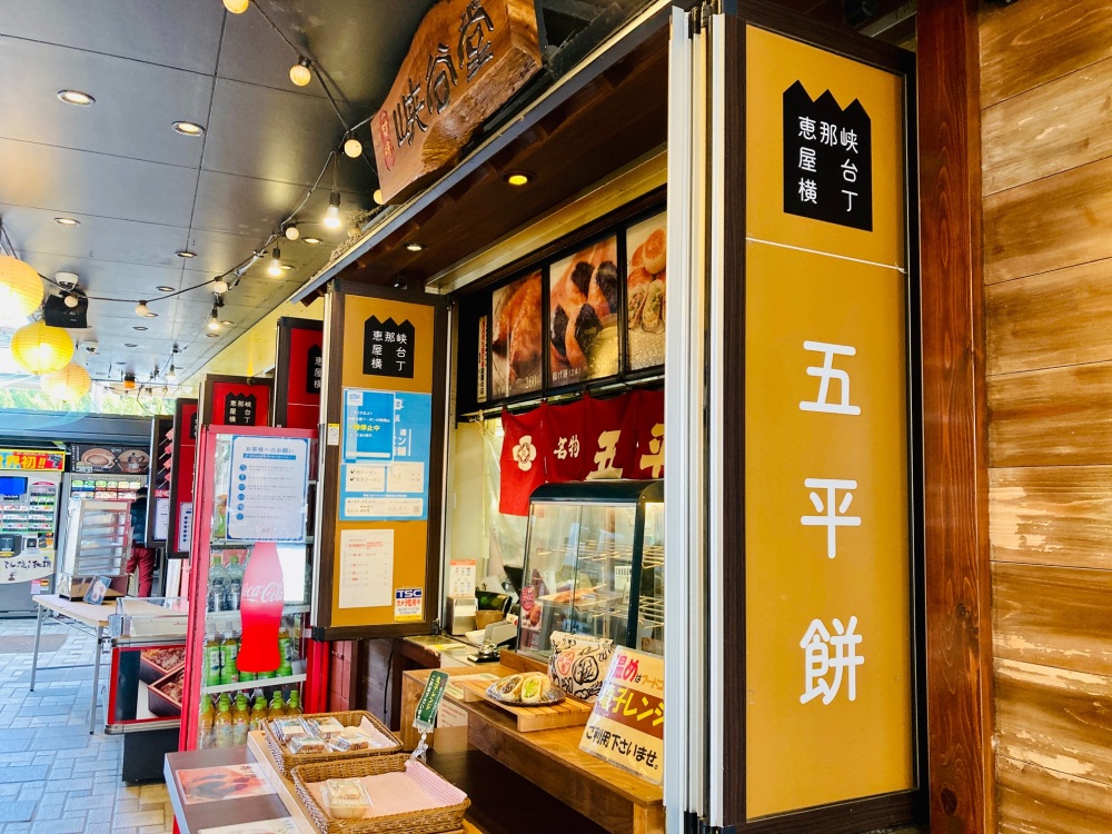 恵那駅から徒歩7分。だんごの絵が描かれた可愛い看板が目印の五平餅屋です。テイクアウトのみのお店で注文は5本以上から。お米は地元産のコシヒカリを使用。三つ玉団子にオリジナルの甘辛いタレをたっぷりつけ、1本づつ丁寧に焼き上げた五平餅は冷めても美味しいと評判。持ち帰ってからも美味しく食べてもらえるよう火を落とし目にし表面をコーティングしながら焼く等の工夫をされている、お店の方の心遣いが嬉しい五平餅です。