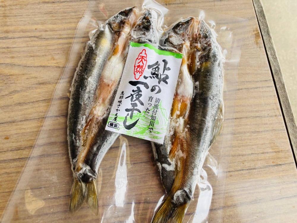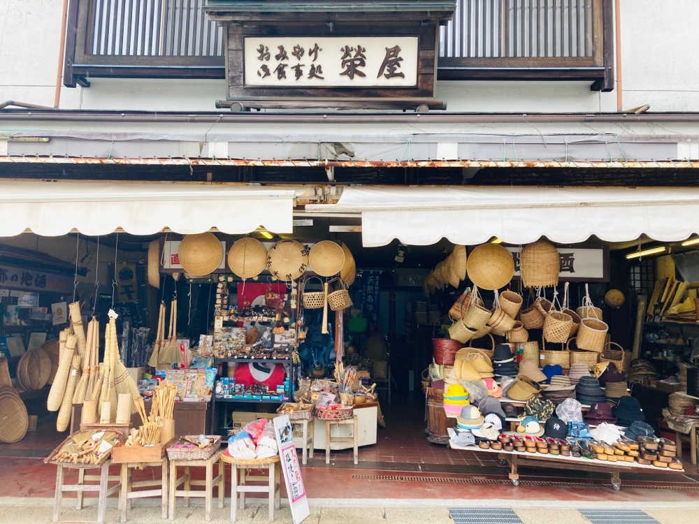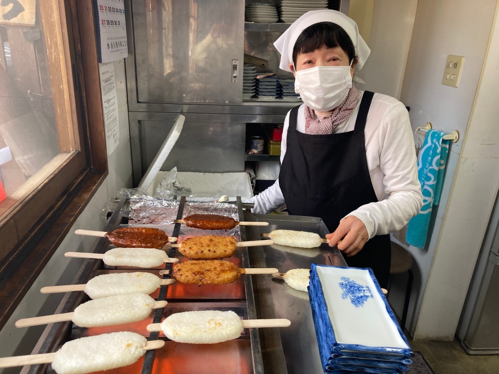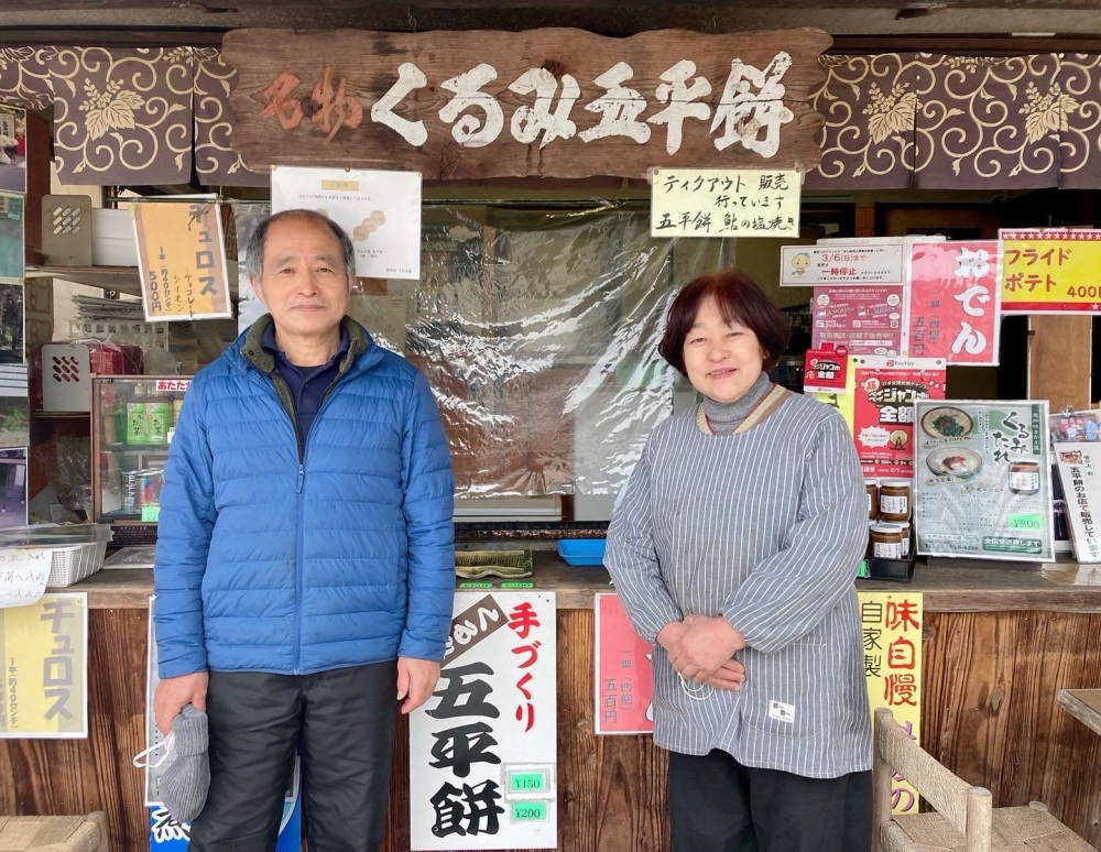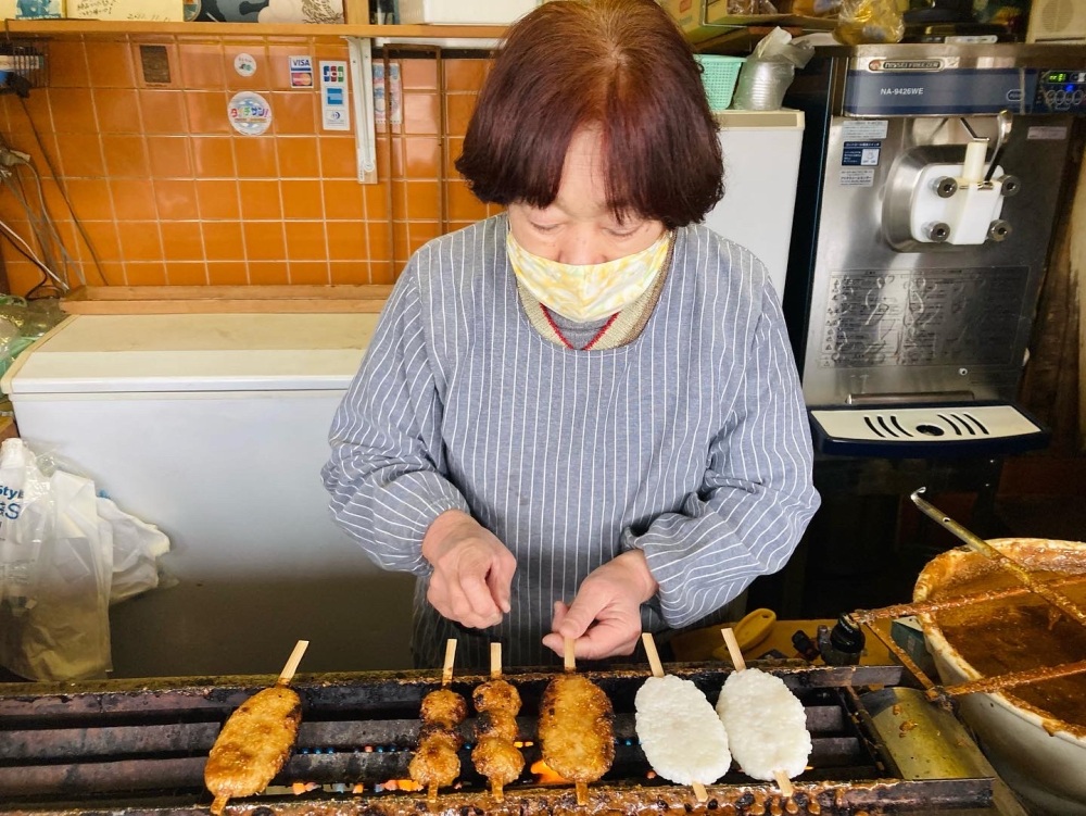 恵那峡遊覧船乗り場まで100mのところに店舗を構える「恵那峡さかえ屋」。店名は、奥様の名前「栄子」さんから名付けられたという仲睦まじいご夫婦が営んでいます。創業48年の手作り五平餅は、だんご型とわらじ型があり、お米は地元産、タレには国産のくるみを使い、串はご主人が竹藪から竹を切って作っているというこだわりよう。奥様が作るおでんや、鮎シーズンに漁師のご主人がとってきた天然鮎の塩焼きも人気です。