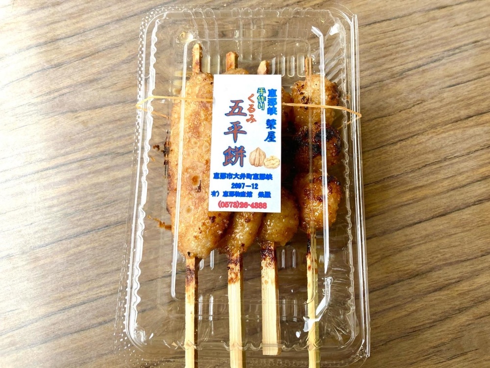 店舗での販売はもちろん、通販や、イベントなどで広く五平餅の魅力を伝えている「ふるやの五平餅」。くるみ、ごま、落花生を使用したタレで焼く香ばしい味と香りが郷愁をそそる懐かしい一品です。恵那峡サービスエリア(上り)の「峡谷堂」でも販売。焼きたてを食べてもらうため、最後にタレを付け、あえて焦がすような炊き加減でさらに香ばしさを加える一工夫を凝らしているとのこと。ドライブのお供にオススメです。