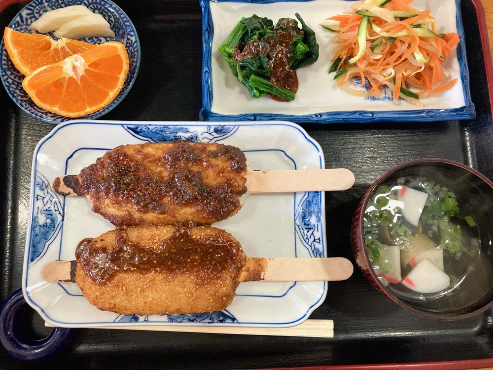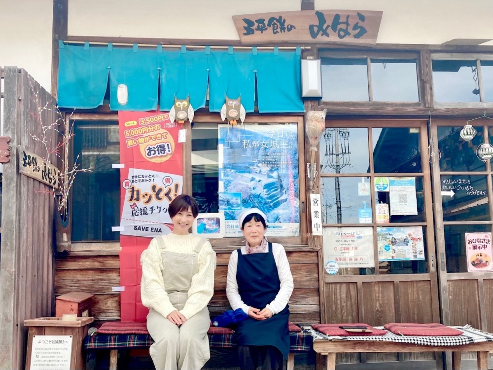 恵那市岩村町にある「みはら」は、NHKの朝の連続テレビ小説「半分、青い。」の舞台となった岩村町本通りに佇む創業41年のお店。人気の五平餅は、わらじ型で、タレは「ごまだれ」と、地元のネギで手作りした「ネギ味噌」の2種類の味付けが楽しめます。五平餅にお味噌汁、サラダ、おひたし、フルーツがついた「五平定食」は750円。人の繋がりを大事にしているという女将さんの、あたたかいおもてなしも魅力のお店です。