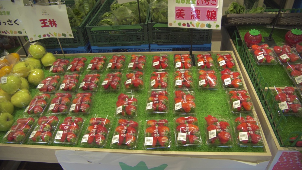 新鮮野菜や岐阜県産の苺が並ぶ。