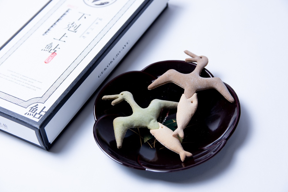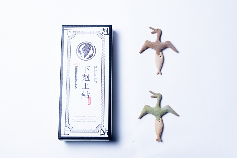 鵜飼では鵜に飲み込まれる鮎が逆襲して鵜を飲み込んでいるのが面白いポイント。岐阜が誇る知将、明智光秀に触発されたお菓子とのこと。鮎は岐阜のはつしも米粉を使用した和三盆糖味が、鵜の部分は大麦粉が使われており、黒糖味と抹茶味の2種類があります。