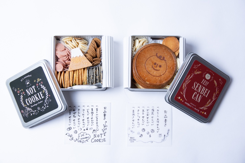 田中屋せんべい総本家でもう一つ紹介したいのが、煎餅を一缶に詰め合わせた「NOT COOKIE」「YES! SENBEI CAN」(共に1,620円・税込)。店の人気商品であるふんわりさくさくのミニ煎餅や富士山型の玉子せんべいなどがぎゅっと詰まっており、ふたを開けた時に感動すること間違いなしです。