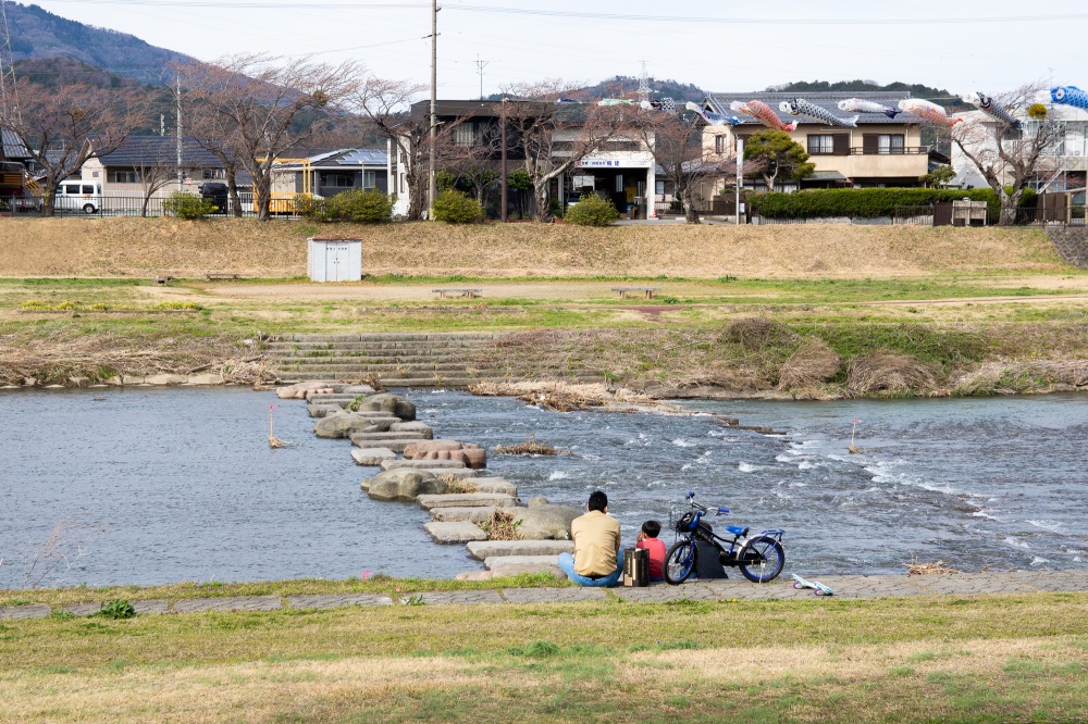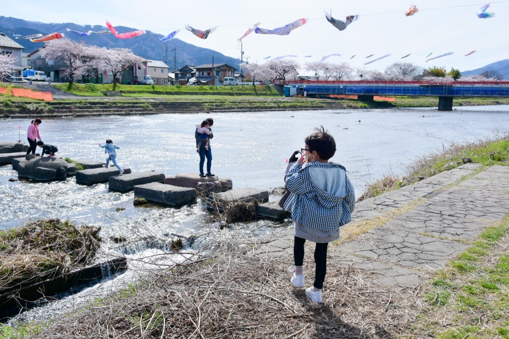 こいのぼりが泳いでいる相川には両岸に渡ることのできる飛び石があります。会場の両端にかかる相川橋や御幸橋まで大回りして渡ることもできますが、この飛び石をぴょんぴょんと楽しんで渡っている人がたくさんいらっしゃいます。