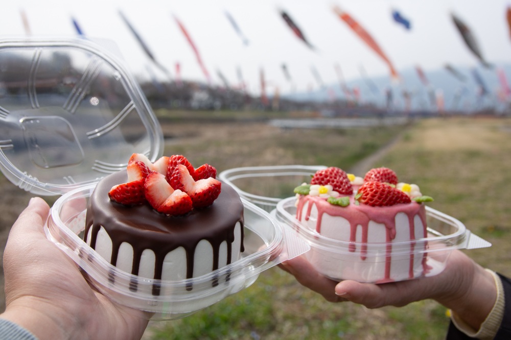 こいのぼりを見ながらピクニックを楽しんでいる方もいらっしゃいます。そんな時におすすめのグルメの一つが同町にある「まんじゅどーむ」というカフェのふわとろシフォンケーキ ! チョコレートが垂れるようにデコレーションされていて写真映えも抜群です。
