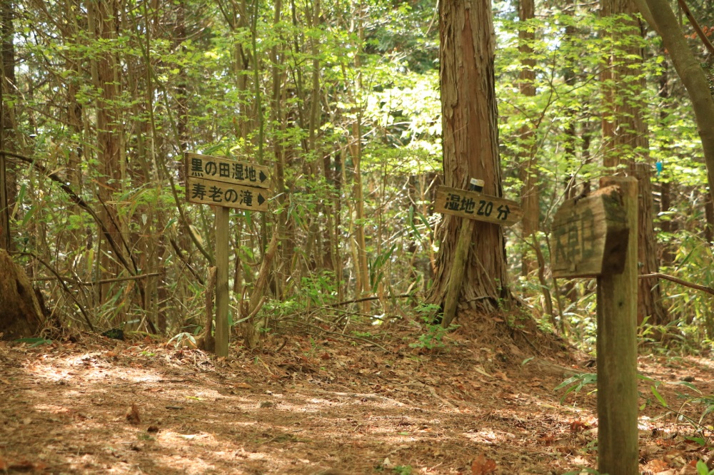 入山後、約1時間ほどでT字分岐へ到着。北へ行けば山頂ですが、その前に屏風山の人気スポット「黒の田(くろのた)東湿地」を目指しましょう。