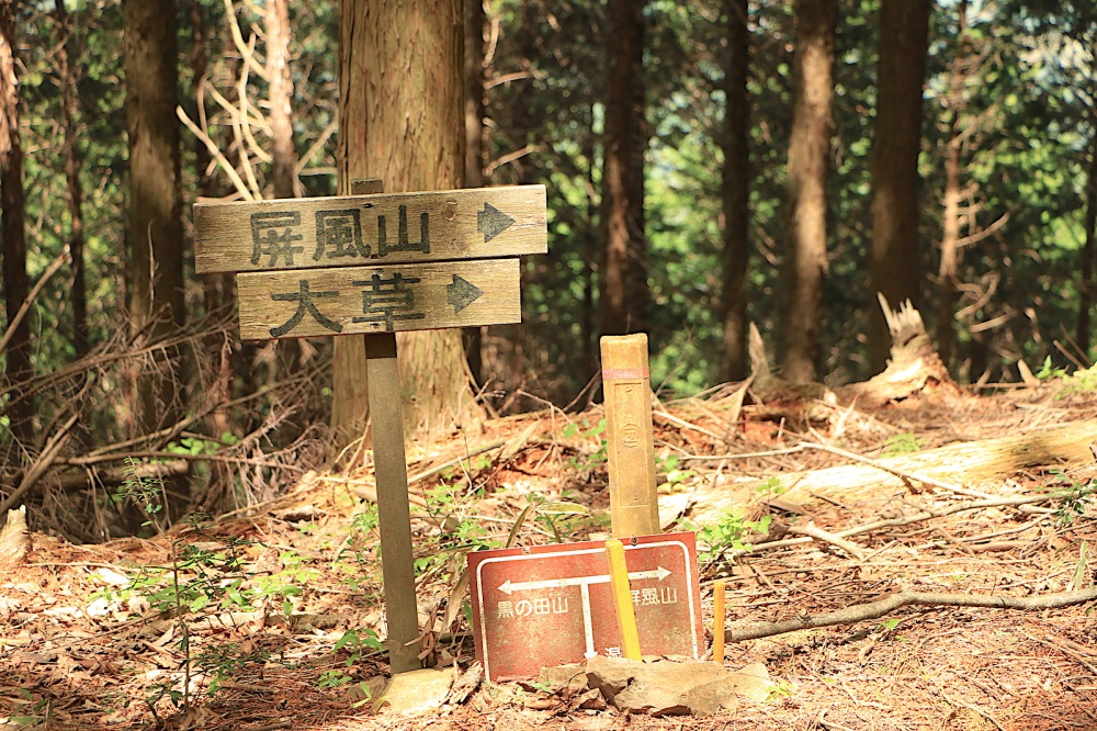 名前の通り、屏風を立てたような連山となっているのが特徴。大草(おおくさ)登山口を起点に、歩きやすい登山道も整備されており、地元ハイカーによく親しまれている里山です。