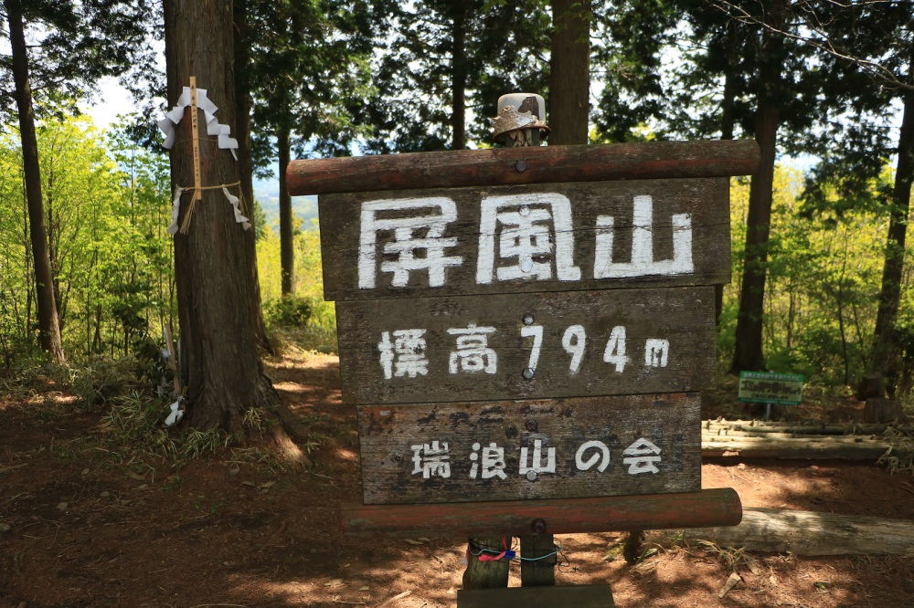 登山開始から約2時間30分で「屏風山」山頂(標高794m)へ到着!山頂に立つ大きな標識が目印です。
