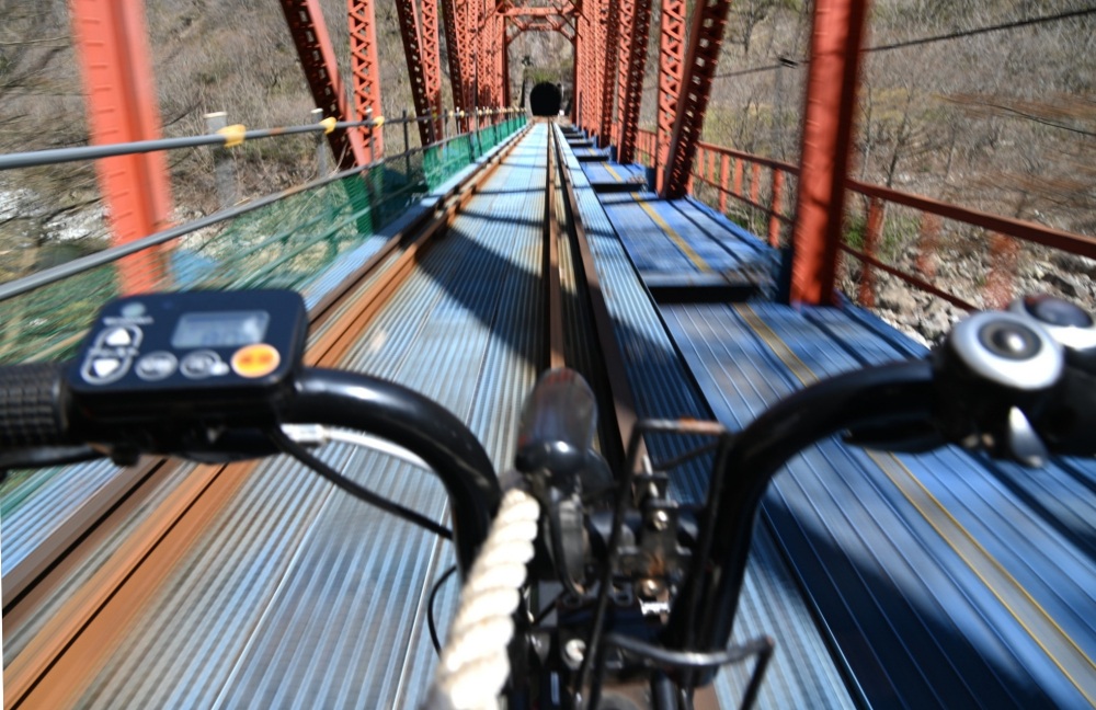真っ暗なトンネルを抜けると赤い鉄橋が。足元が透けており、はるか眼下に美しい渓谷が見えます。