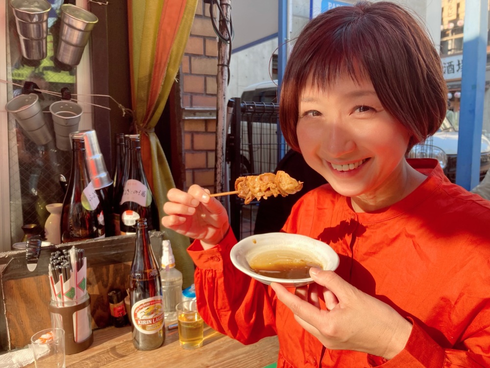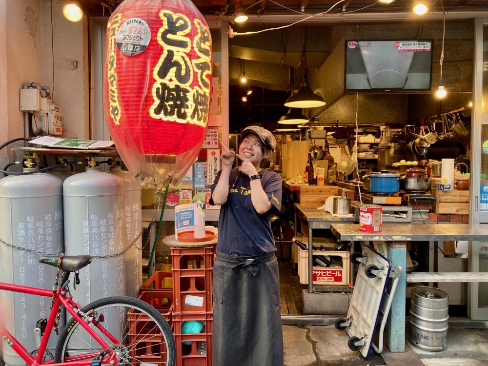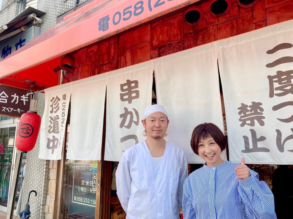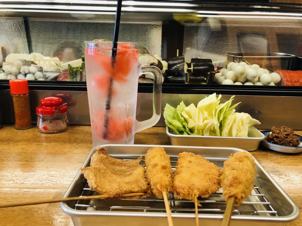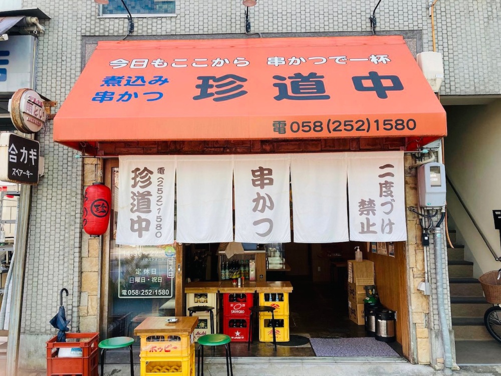 JR岐阜駅から徒歩7分程度の忠節橋通り沿いにある「珍道中」は、昼飲みができるお店で、とにかく串カツが安くてうまい!豚串カツ、ハムカツ、皮の素揚げ串に、この地域ならではの小倉串(つぶあん)なんていう変わり種のメニューもあります。どれも1本130円。お酒は、インスタ映えする紅しょうがサワーがオススメ。中に入っている、紅しょうがをつまみに飲むのもありですよ〜 大将もとても良い方で居心地満点です!