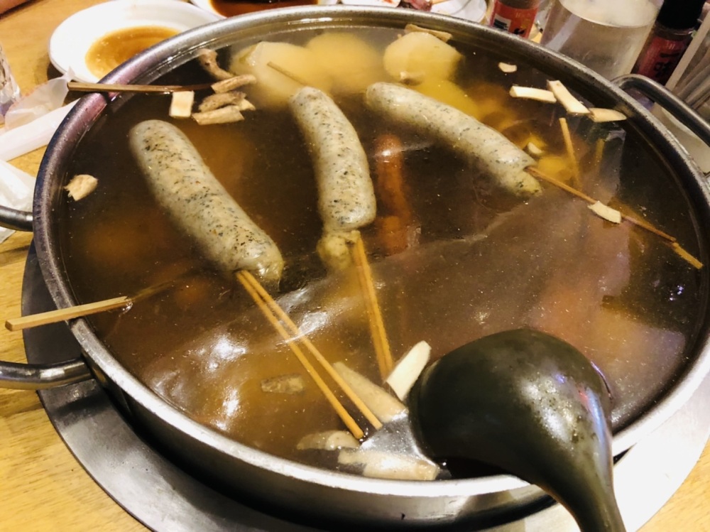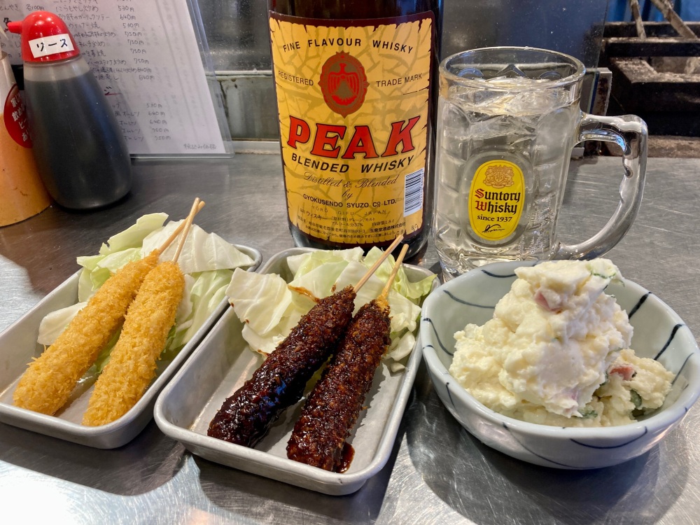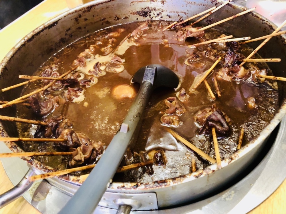 名鉄岐阜駅から歩くこと3分。長住町通にある「水谷本店」は、昼から開店している大衆酒場で、いつ行っても満席の人気店。串は焼き豚以外、全て1本130円というお値打ちさに加えて、昔ながら愛された地元の味が楽しめます。串はどれも美味しいですが、肝焼きと、どて煮が、絶品。瓶ビールが進みます。この日も満席だったため、即席テラスで一杯。この昭和の雰囲気が良いんですよね〜まさに、千円でべろべろになれました!