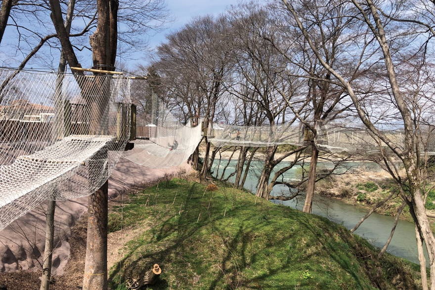 木々の間に、ロープや丸太の足場を備えた全長280メートルのアスレチックは、5歳以上の子どもから大人まで楽しむことができます。近くには、長年人気の温泉・岩盤浴施設や市場などがあり、アウトドアを楽しみながらも、日々の疲れをしっかりと癒すことができますよ。