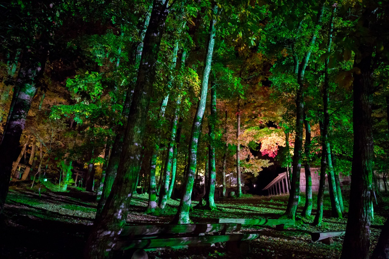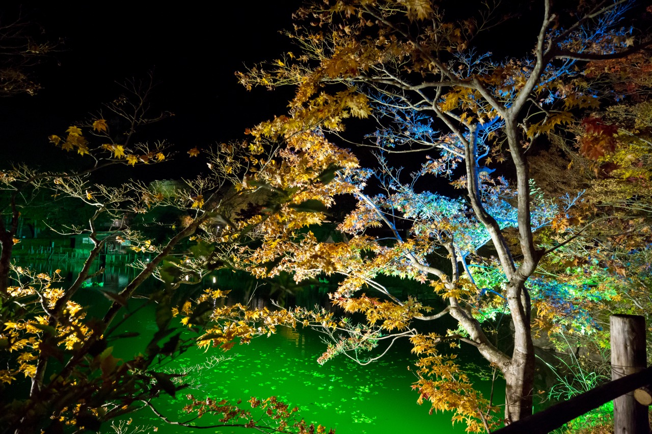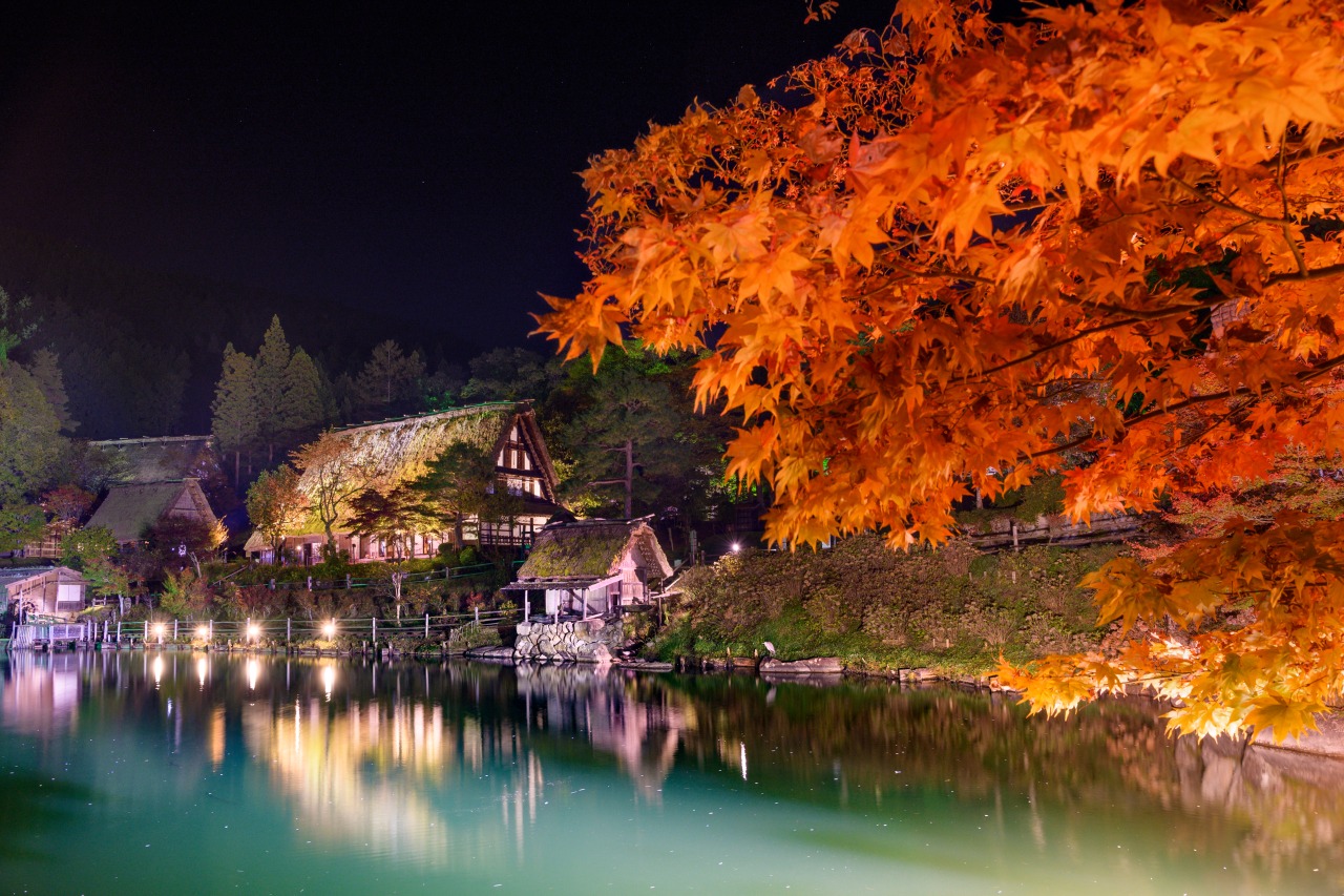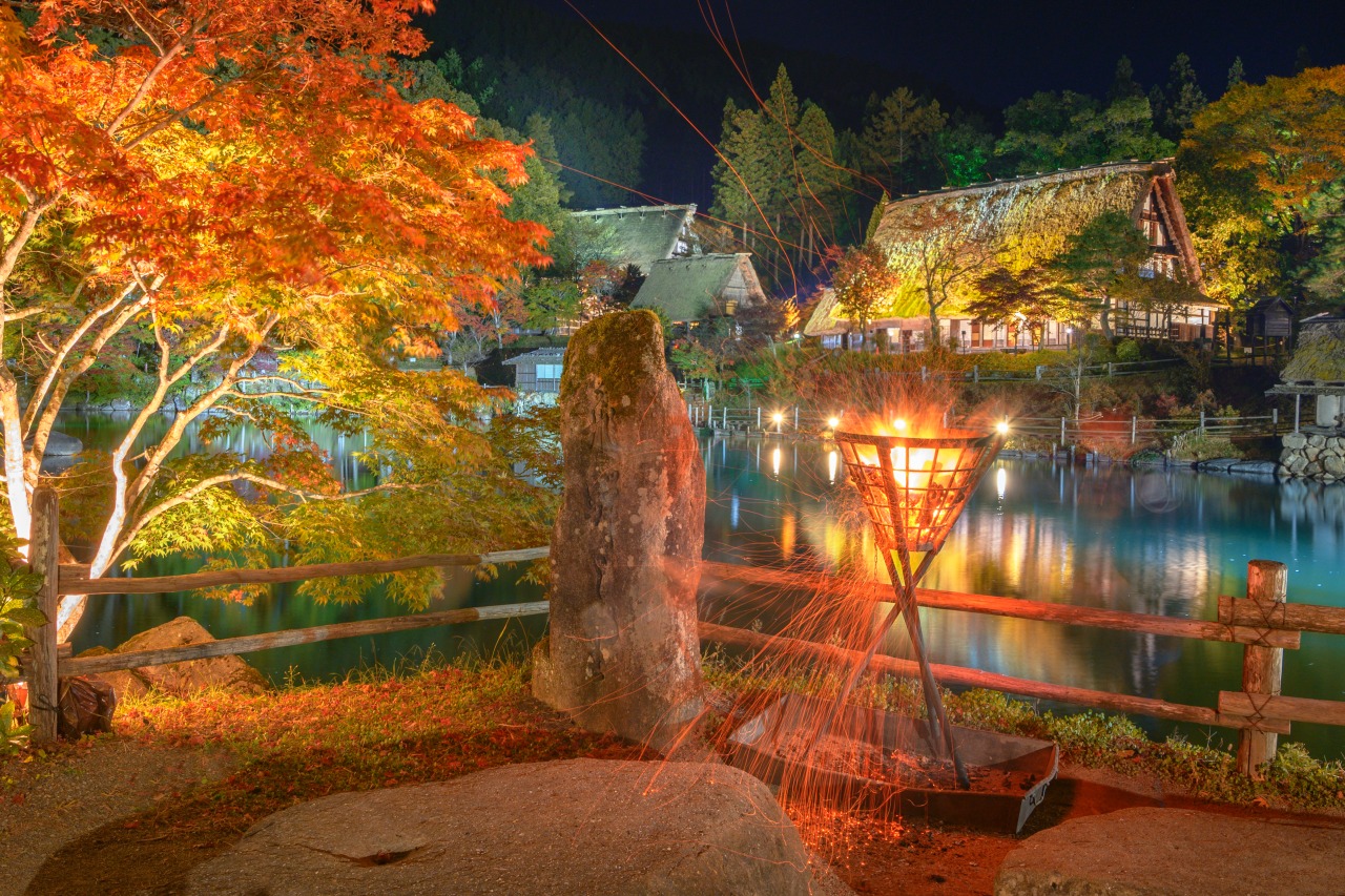 歴史ある飛騨の民家が移築され、昔の農山村の風景が見られる飛騨の里。木々が色づきはじめた里の夜をライトアップで演出します。昔ばなしに入り込んだかのような世界へ訪れてみて。