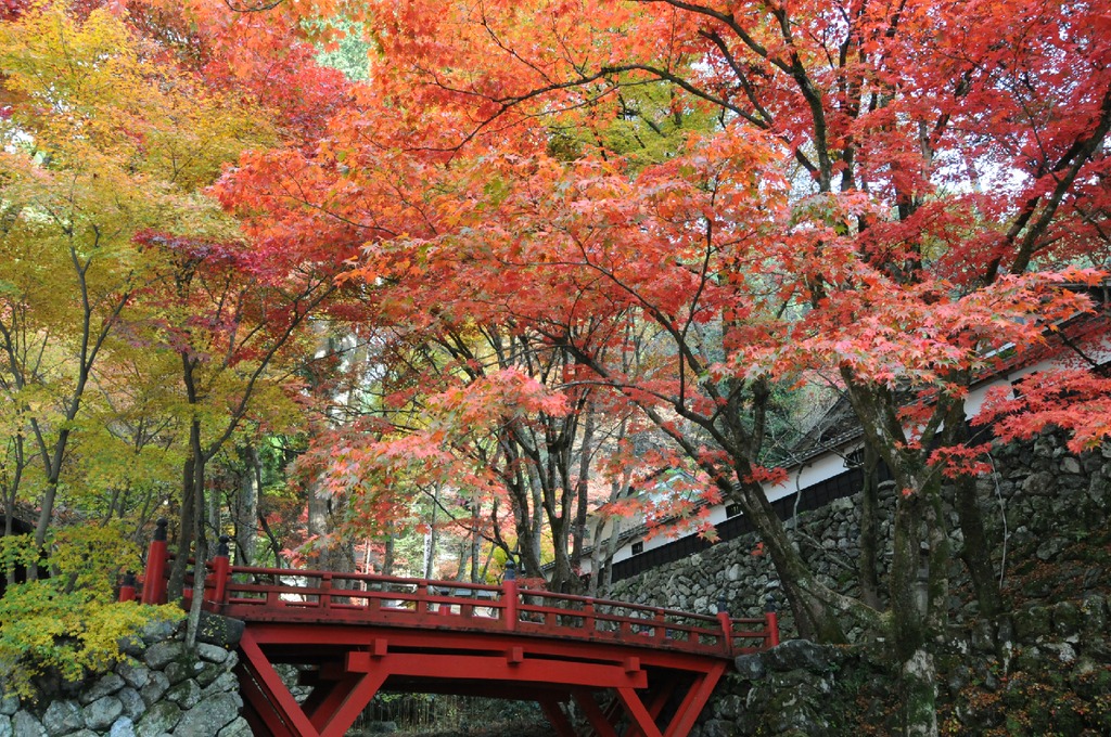 境内一帯にもみじ・かえでが植栽されており、医王橋の赤とお寺の白壁ともみじのコントラストがとてもきれいです。