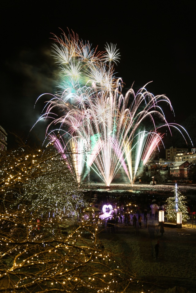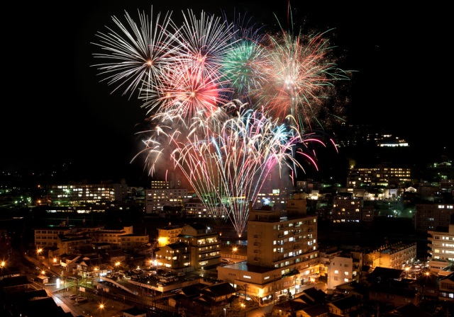 下呂温泉街を南北に流れる飛騨川の形状を活用したワイドな舞台で花火が舞い上がります!