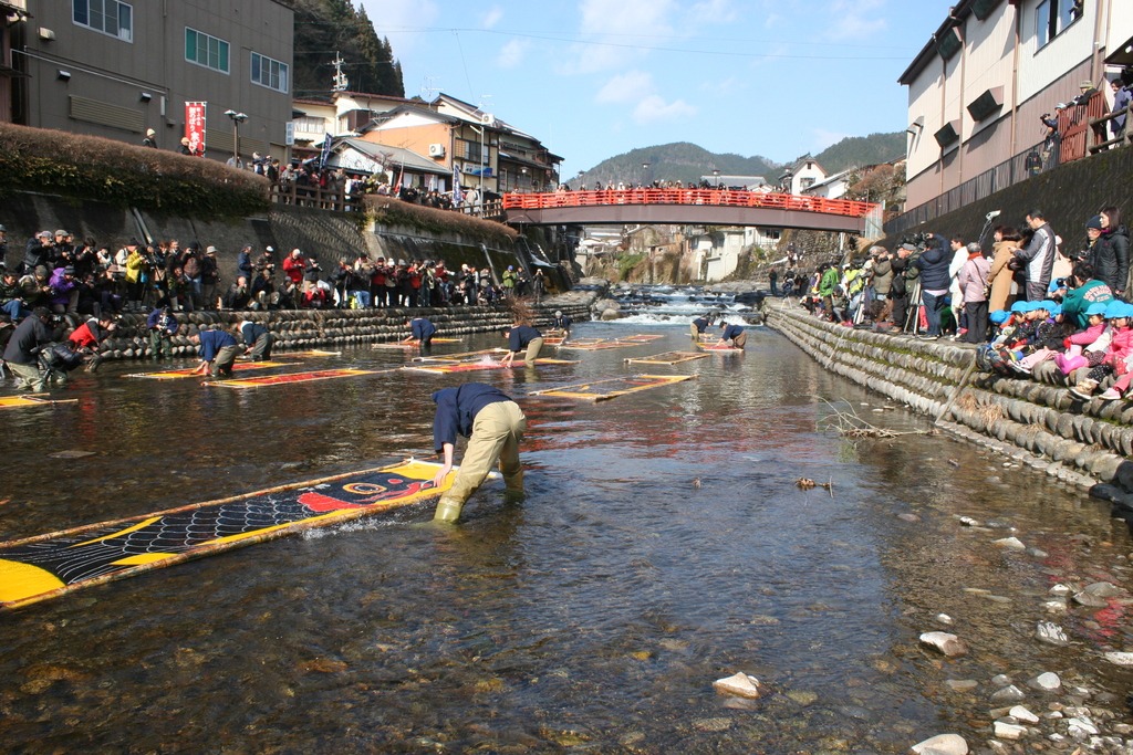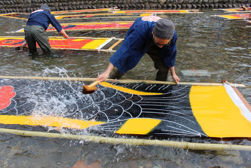 「寒ざらし」とは、岐阜県の重要無形文化財である「郡上本染」の手法で描かれた鯉のぼりを小駄良川にさらし、布についた糊を落とす作業です。冬の冷たい清流で洗うと布が引き締まり、鮮やかな色になります。身を切るような寒さの中、郡上本染の技術を伝承者たちが伝統の技を披露します。