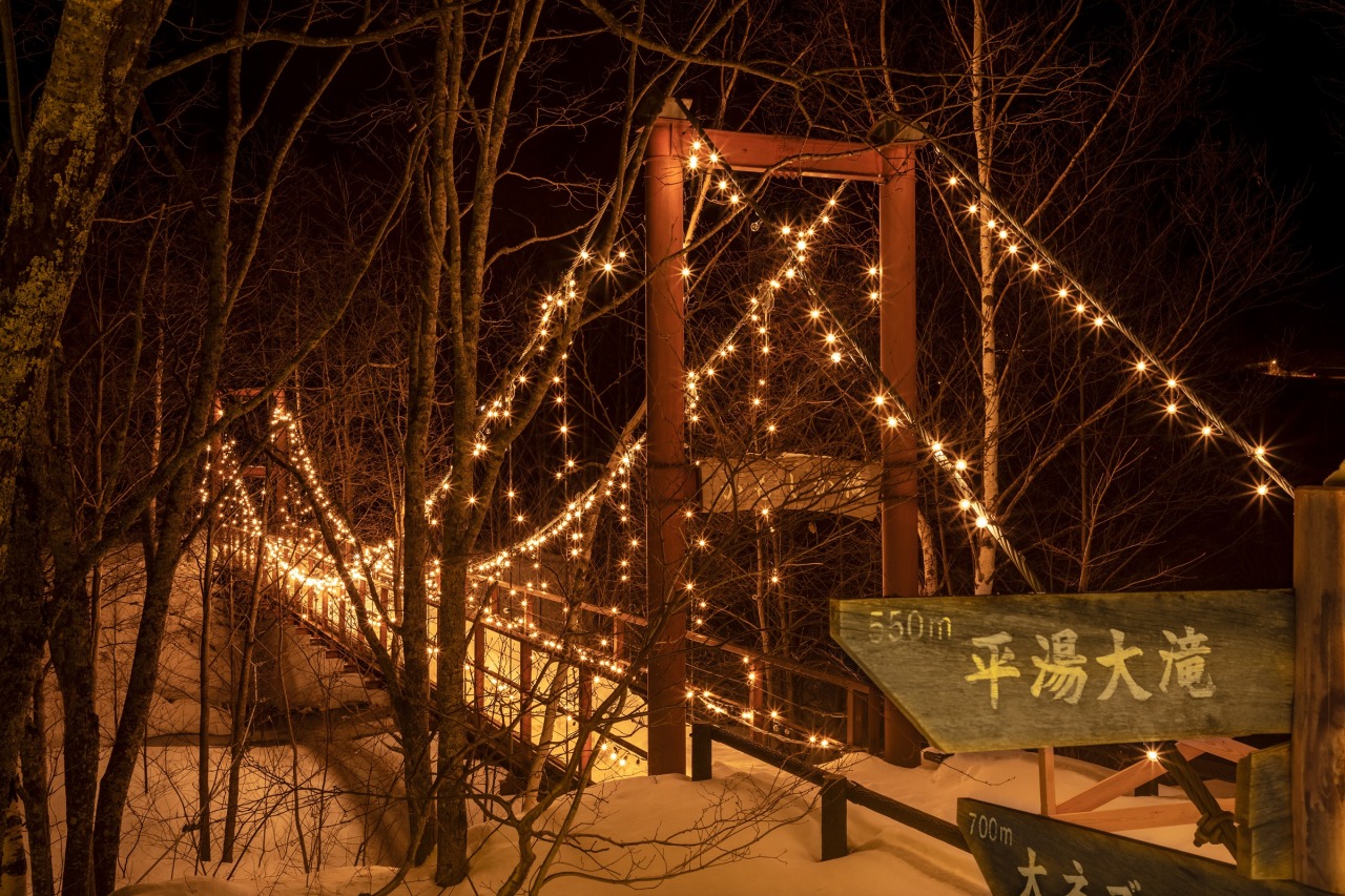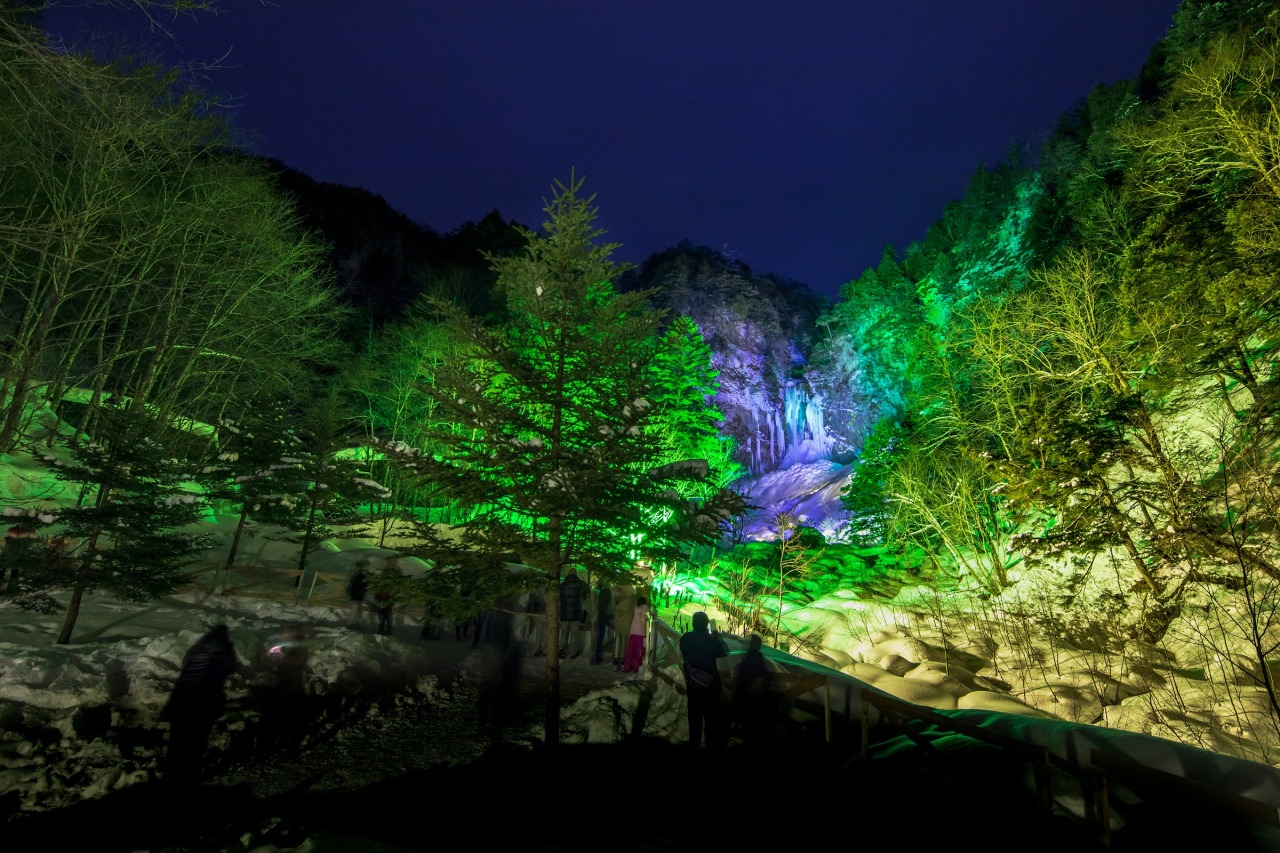 飛騨三大名瀑のひとつ「平湯大滝」は落差64メートルで、12月下旬の厳冬の訪れとともに巨大な氷柱へと姿を変えていきます。「平湯大滝結氷まつり」では、氷柱を緑や青の光でライトアップします。