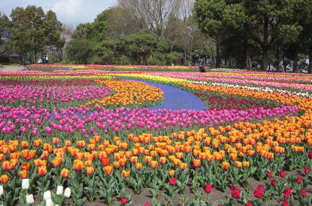 130品種、約24万球のチューリップ・ムスカリ、ヒヤシンスが木曽三川公園の一面を彩ります。