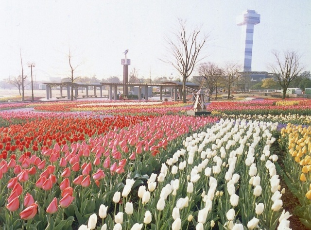 色とりどりのチューリップが植えられ た花壇脇には、桜が植えられているので、チューリップの開花が早ければ、同時に楽しめます。