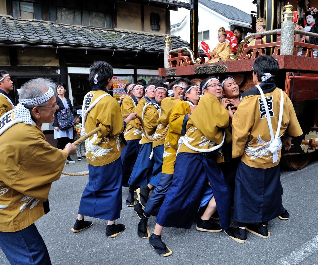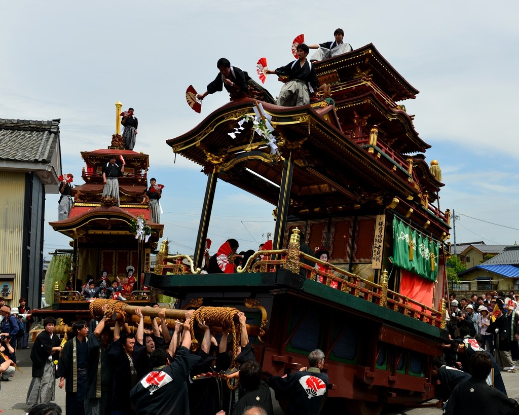 西町の攀鱗閣(はんりんかく)、東町の鳳凰山(ほうおうざん)、中町の紫雲閣(しうんかく)の3輌は、いずれも精巧な造りに漆塗り、蒔絵、名工による彫刻金具などを施した絢爛豪華なもので、その雄大華麗な姿は“動く陽明門”と賞賛され、県重要有形民俗文化財に指定されています。